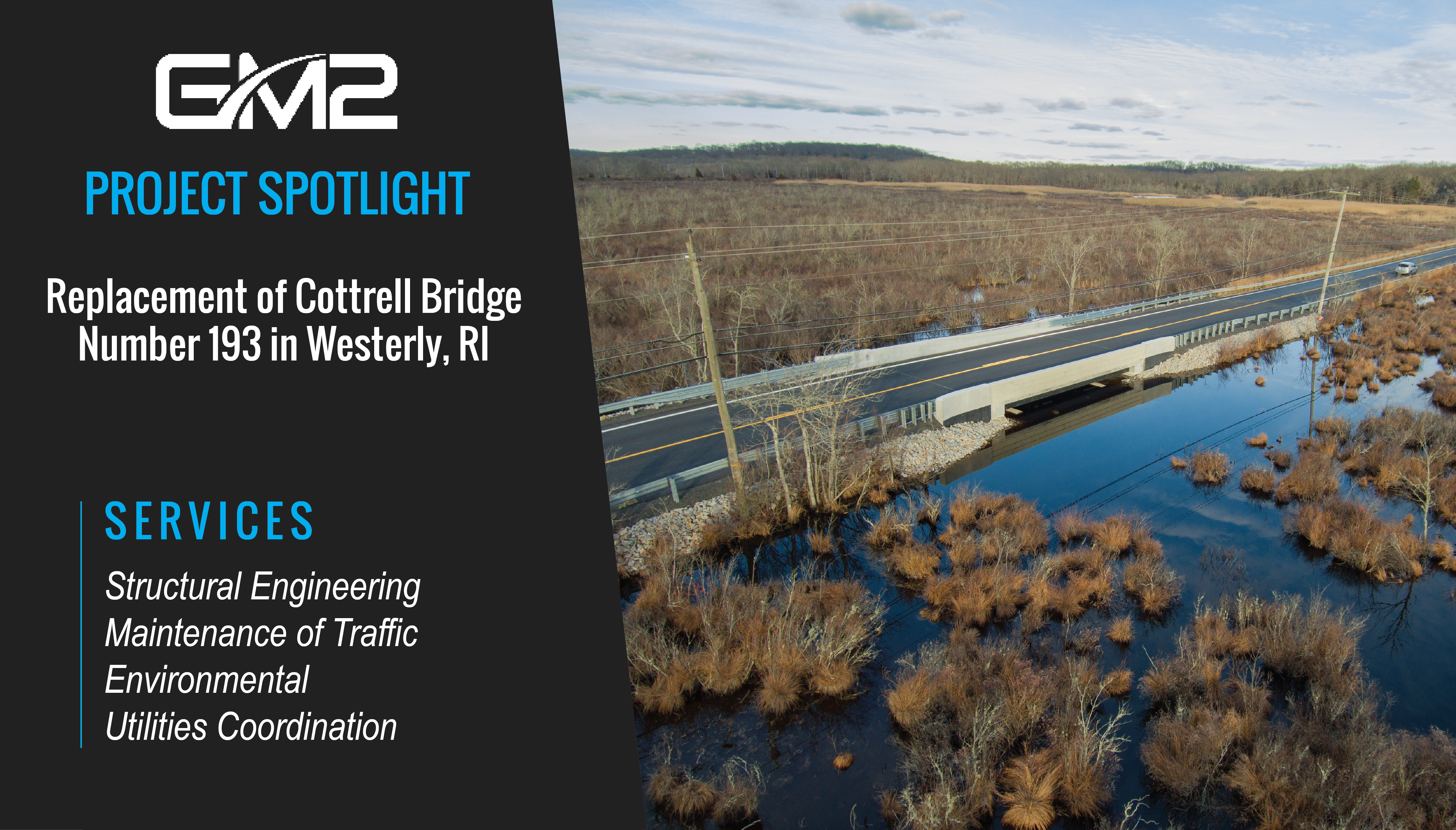 GM2 completed the design of the replacement Cottrell Bridge No. 193, which carries Westerly-Bradford Road (RI 91) over McGowan Brook in Westerly, RI. The new bridge is a single-span composite tub girder structure consisting of pile supported precast concrete… Read More