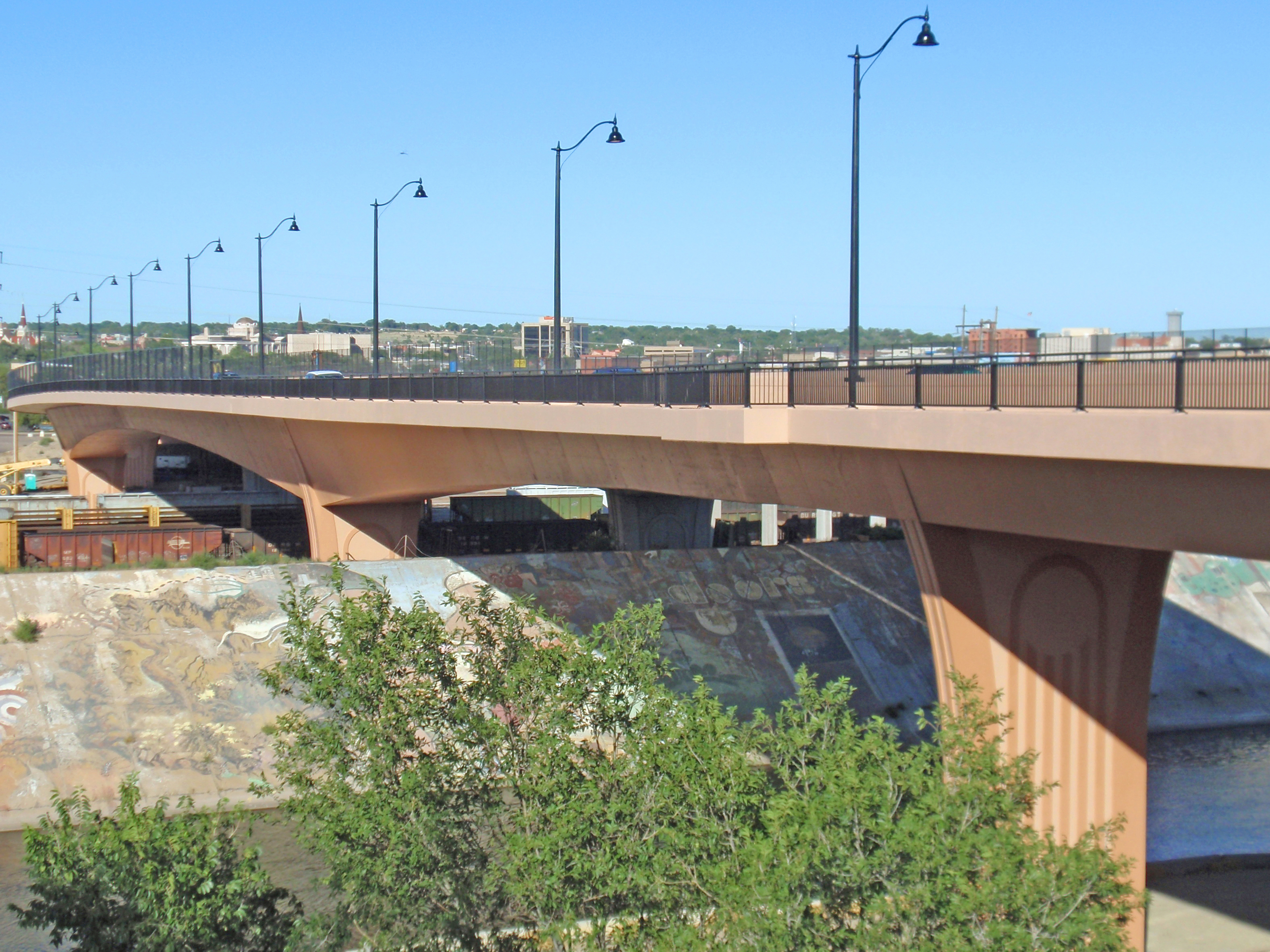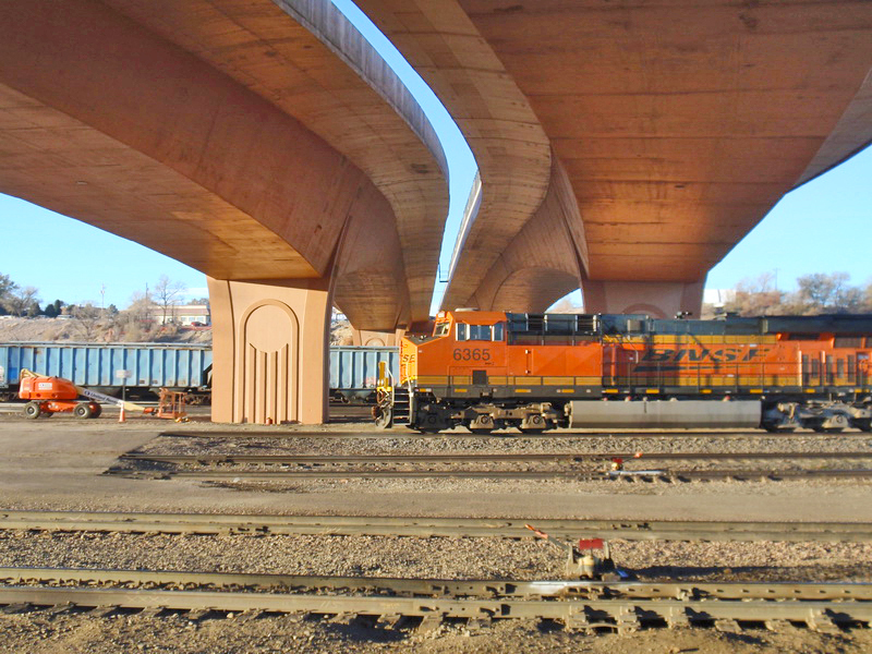 The design is twin, cast-in-place post-tensioned segmental box girders built from above in balanced cantilever with form travelers. Each girder is 54’ wide and the bridge length is 1,137’. The total bridge width accommodates two travel lanes and a 10’ multi-use sidewalk in each direction. The bridge features five spans, the longest of which is 378’, a record for the longest highway bridge span in the state. The layout provides clear spans over both the Union Pacific Railroad (23 rails) and Burlington Northern Santa Fe Railroad (5 rails) in the Pueblo Yard, thus allowing uninterrupted yard operations.