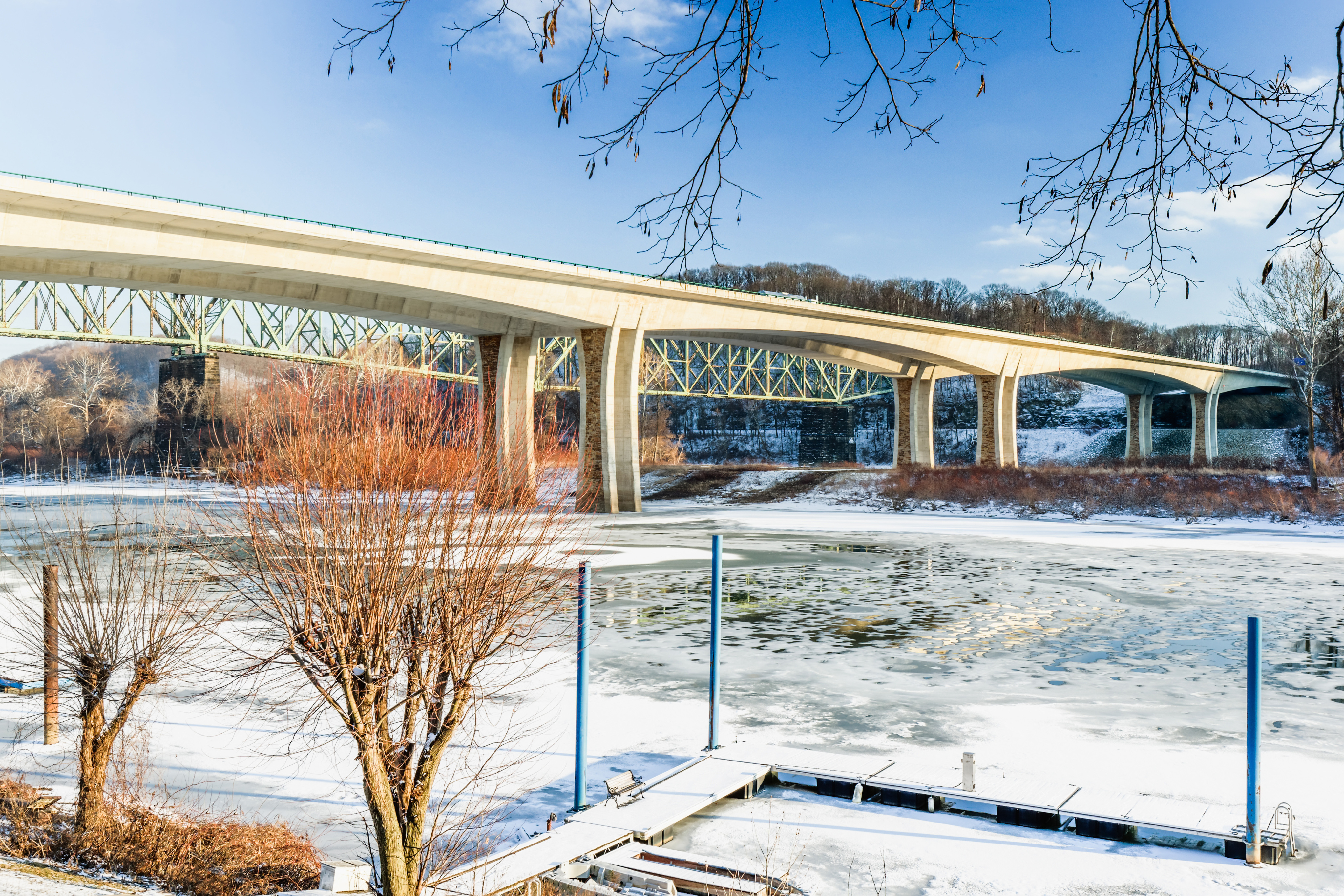 The new I-76 Allegheny River Bridge is the first cast-in-place concrete segmental bridge in Pennsylvania and features a 532’ long main span across the Allegheny River. The twin 2,350’ long structures were built on an alignment parallel to the existing turnpike. Additionally, the bridge spans Freeport Road, active rail lines, the side channel of the river used by recreational boaters and Fourteen Mile Island, part of the Allegheny Island State Park.