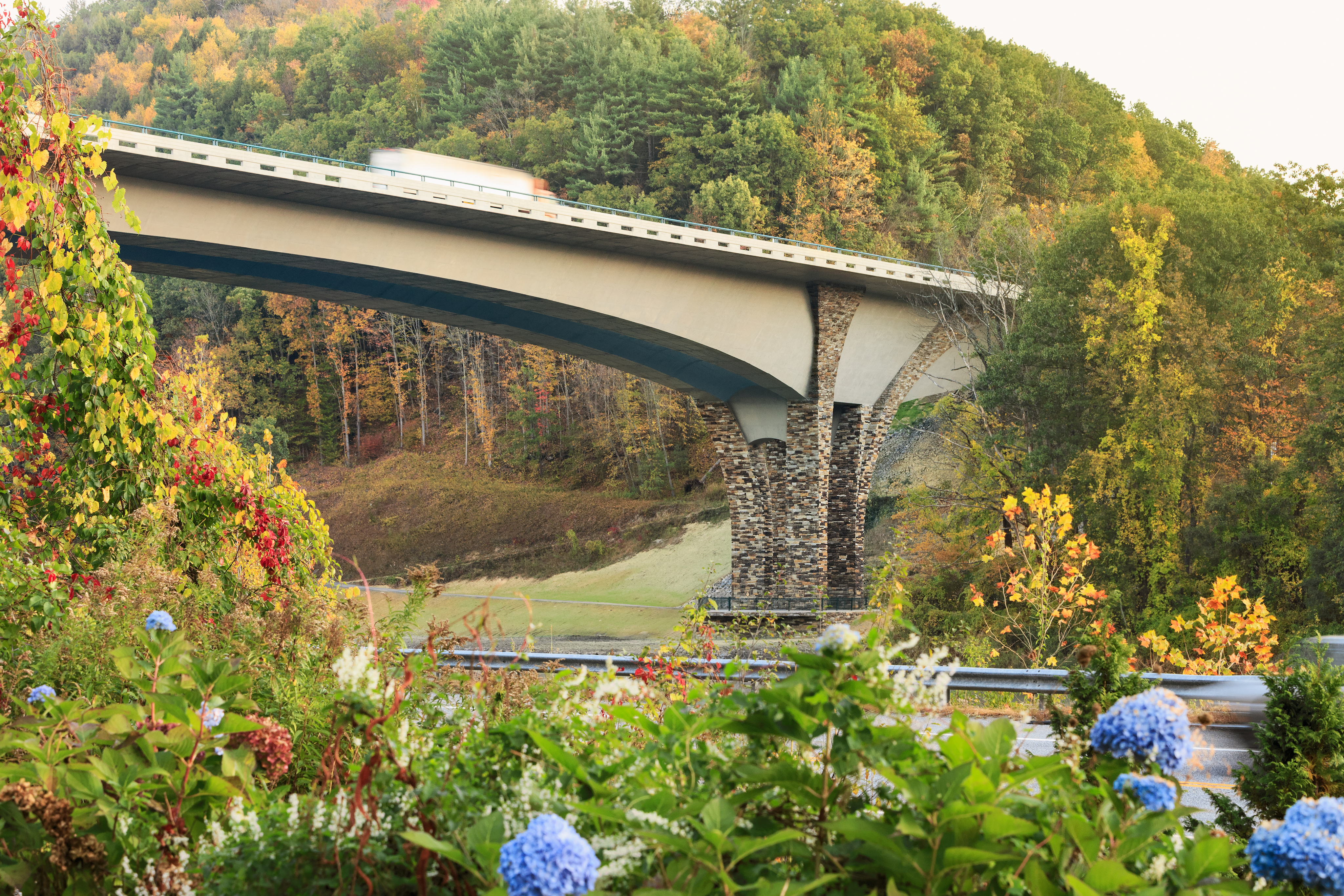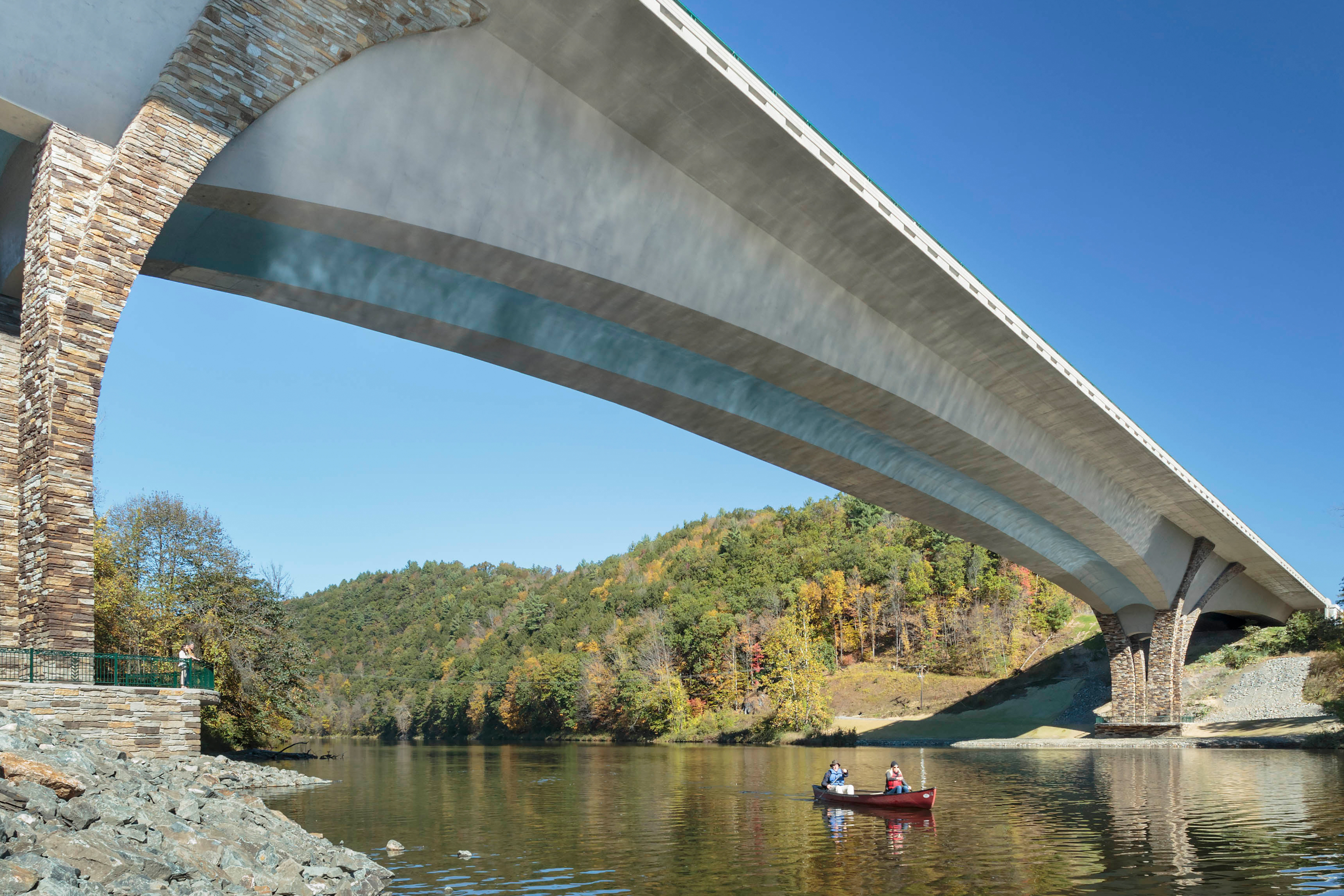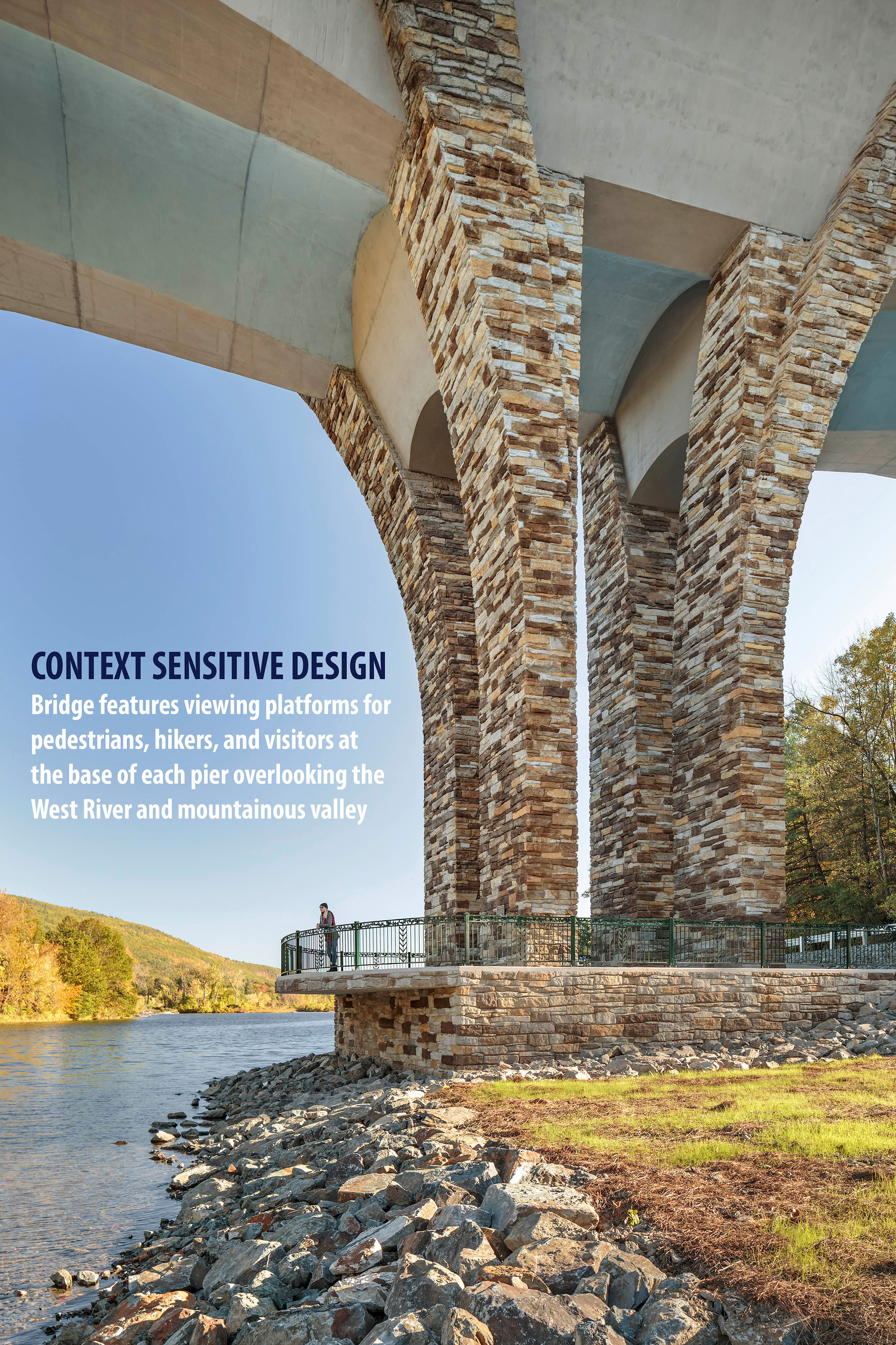 The I-91 Brattleboro Bridge Improvements Project, designed by GM2's Complex Bridge staff, includes the demolition of four existing bridges between Exits 2 and 3 and replacing the four bridges with new structures. New Bridge 8 carries I-91 over a local road using NEXT Beams. New Bridge 9 is a 3-span, 1,036-foot arching concrete bridge over the West River built utilizing balanced cantilever construction. Standing 100 feet above the scenic valley, the 515-foot main span forms an open gateway anchored by curving, cathedral piers. This postcard worthy bridge features viewing platforms for pedestrians, hikers and visitors at the base of each pier overlooking the West River and mountainous valley. True to its theme “A Bridge to Nature,” every detail of the uniquely-shaped superstructure, piers, viewing platforms, and the railings are complementary of the natural landscape. The concrete cantilever construction process off ered minimum impact when crossing busy Vermont Route 30, the West River, and popular West River Trail.