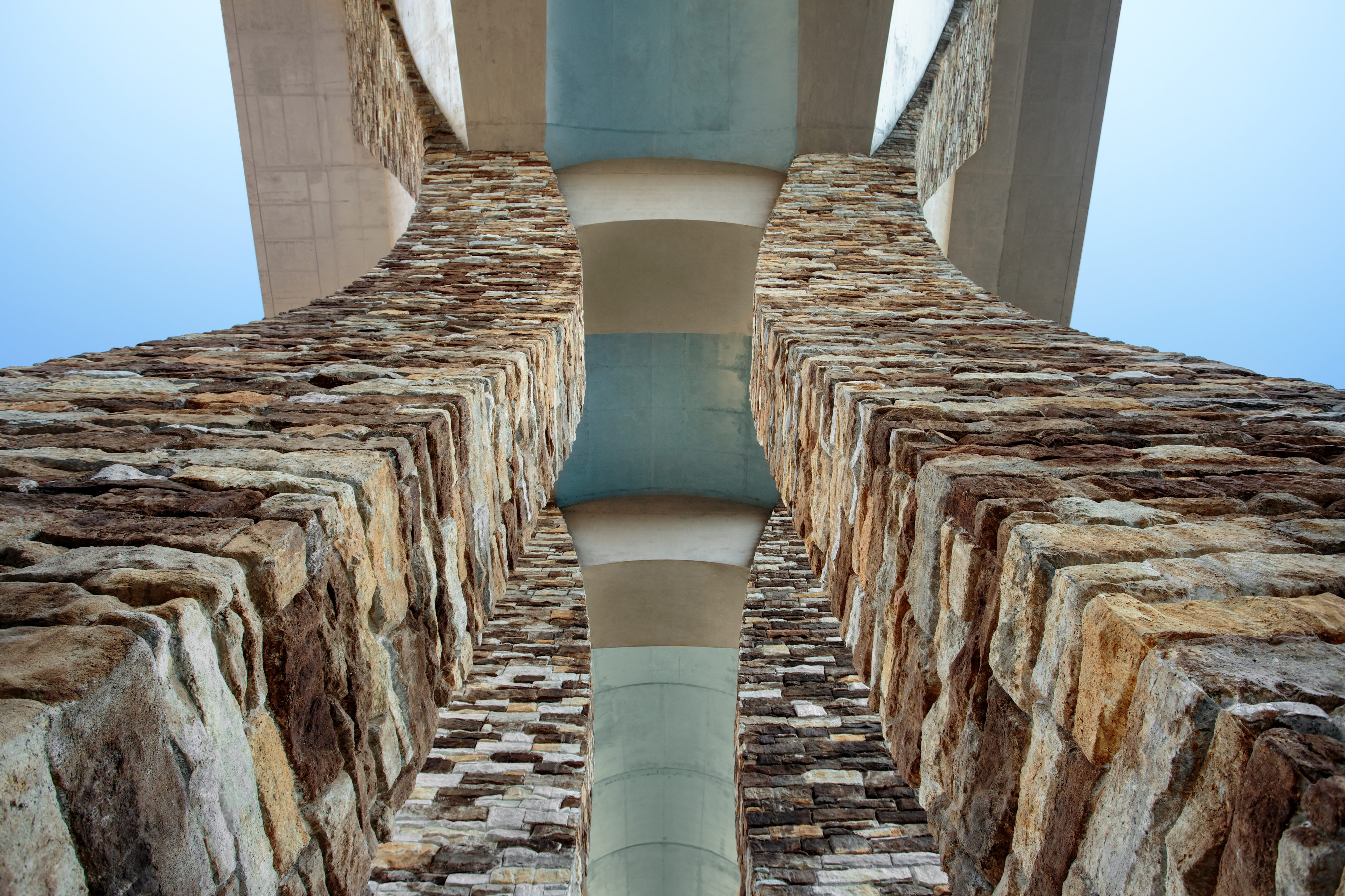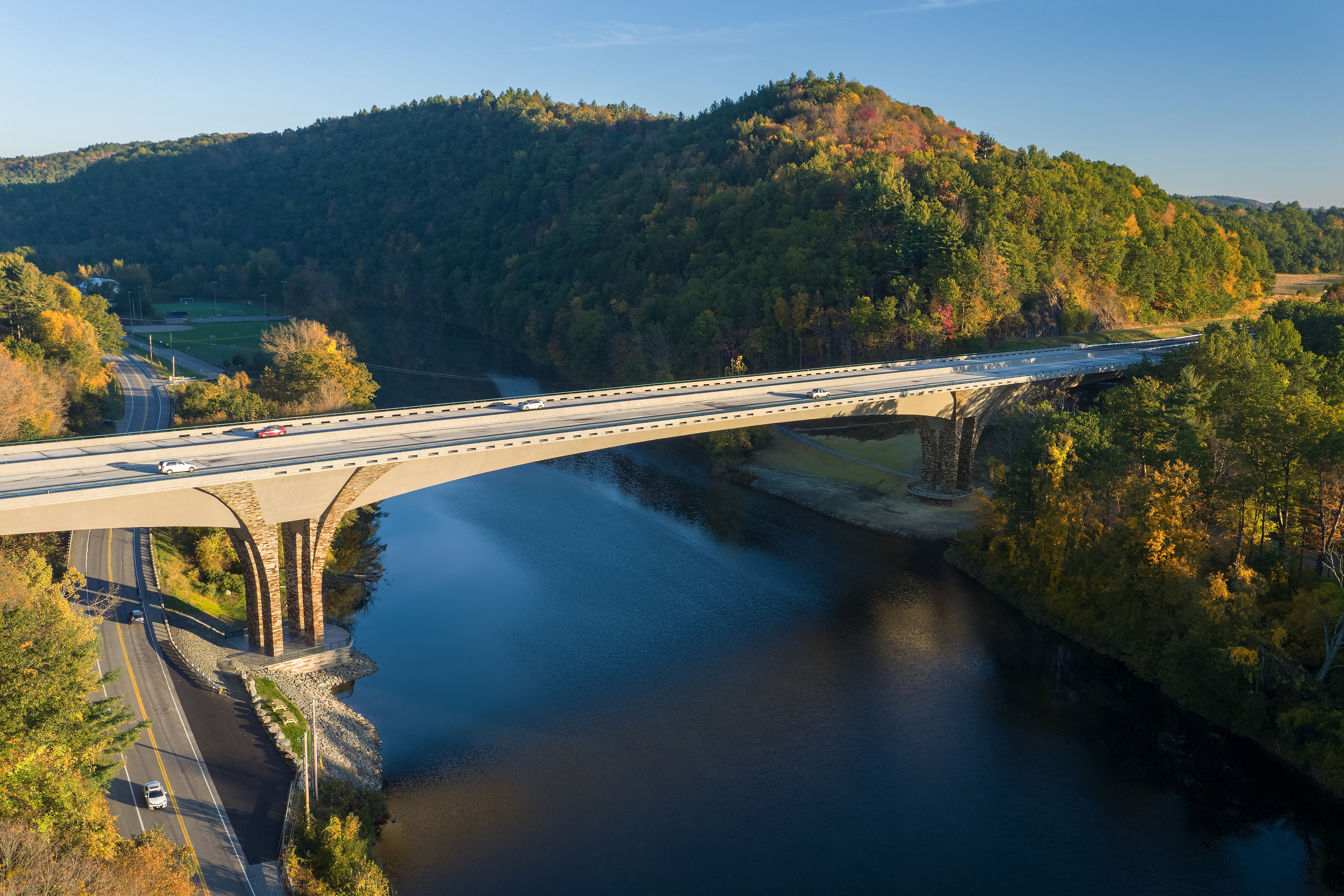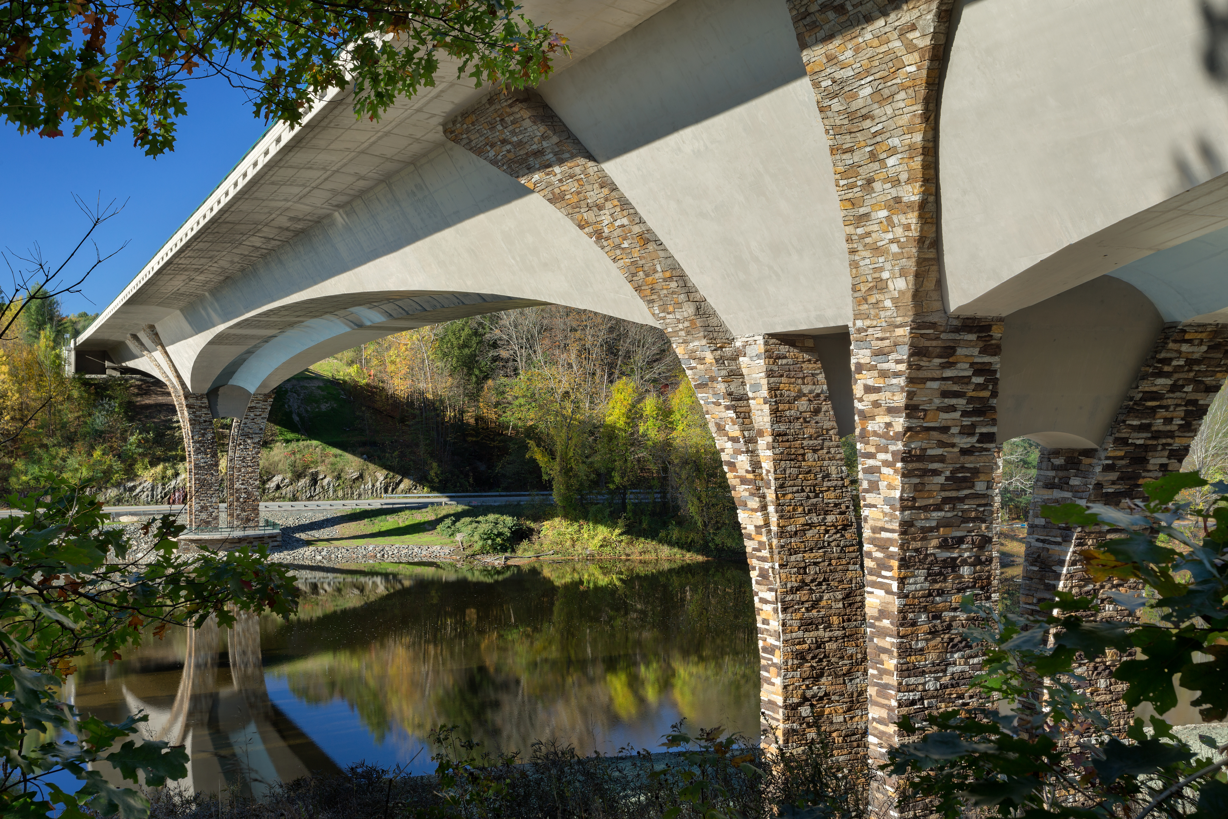 The I-91 Brattleboro Bridge Improvements Project, designed by GM2's Complex Bridge staff, includes the demolition of four existing bridges between Exits 2 and 3 and replacing the four bridges with new structures. New Bridge 8 carries I-91 over a local road using NEXT Beams. New Bridge 9 is a 3-span, 1,036-foot arching concrete bridge over the West River built utilizing balanced cantilever construction. Standing 100 feet above the scenic valley, the 515-foot main span forms an open gateway anchored by curving, cathedral piers. This postcard worthy bridge features viewing platforms for pedestrians, hikers and visitors at the base of each pier overlooking the West River and mountainous valley. True to its theme “A Bridge to Nature,” every detail of the uniquely-shaped superstructure, piers, viewing platforms, and the railings are complementary of the natural landscape. The concrete cantilever construction process off ered minimum impact when crossing busy Vermont Route 30, the West River, and popular West River Trail.