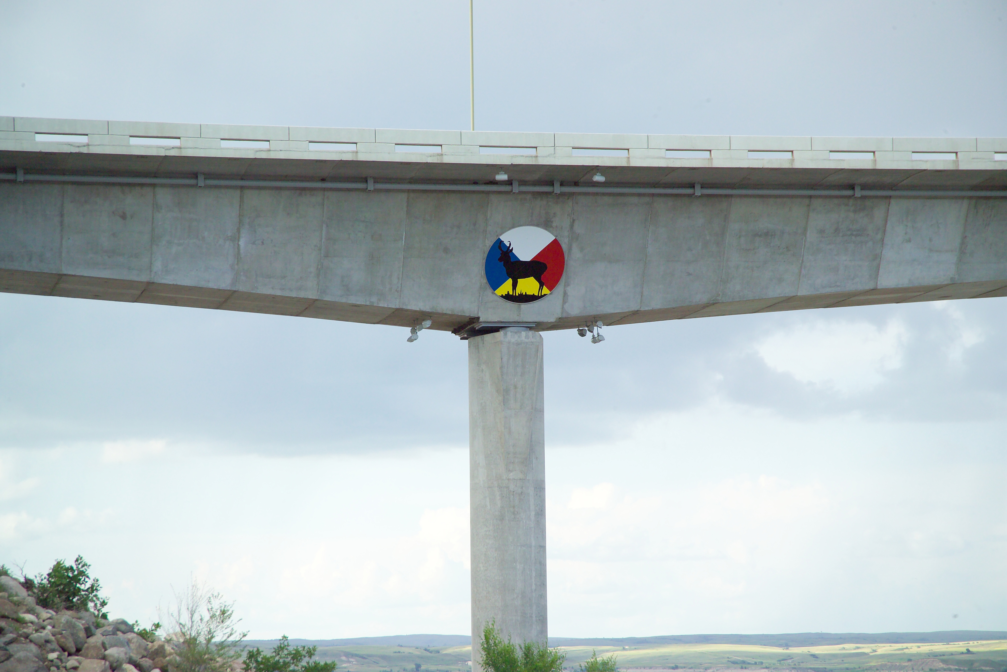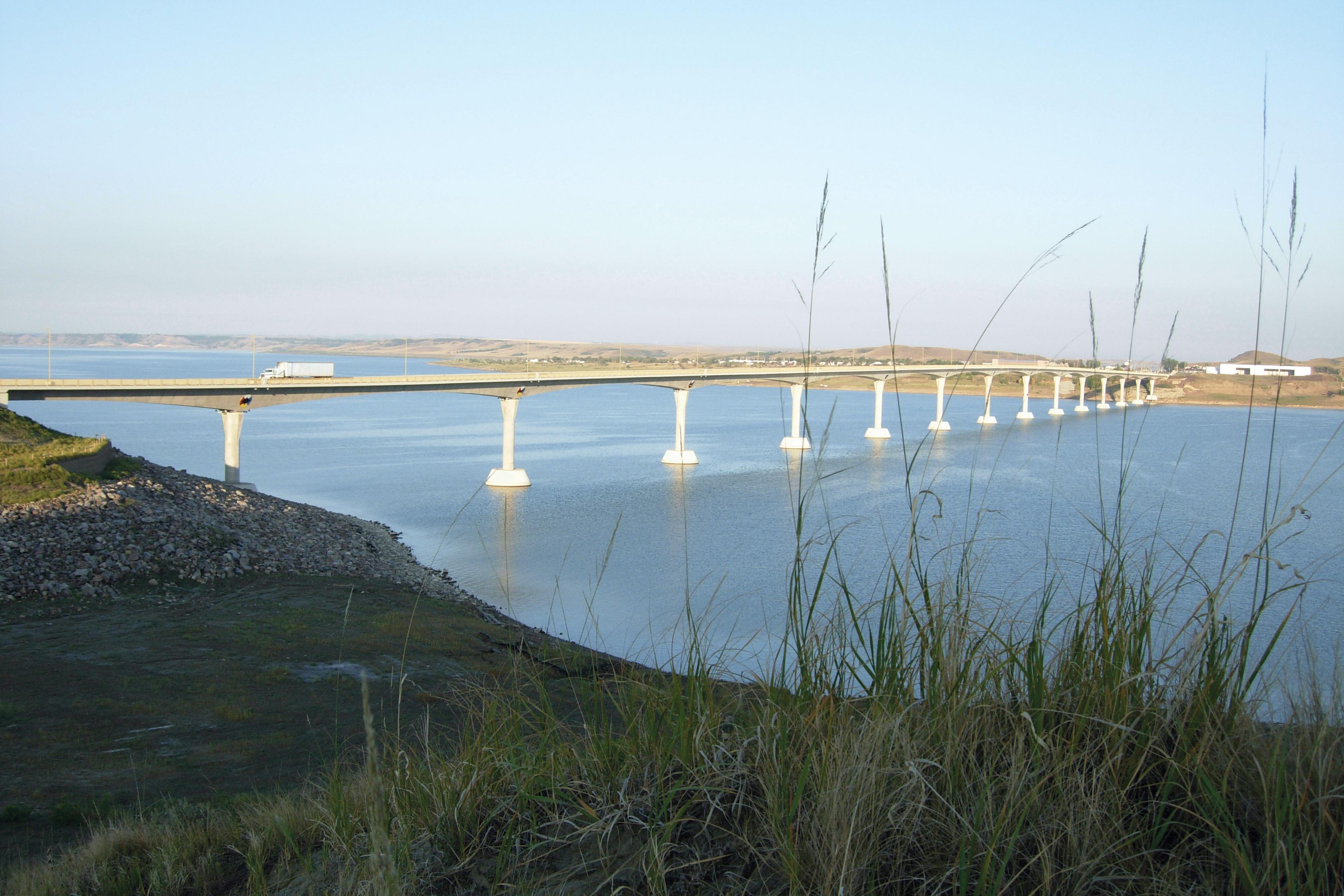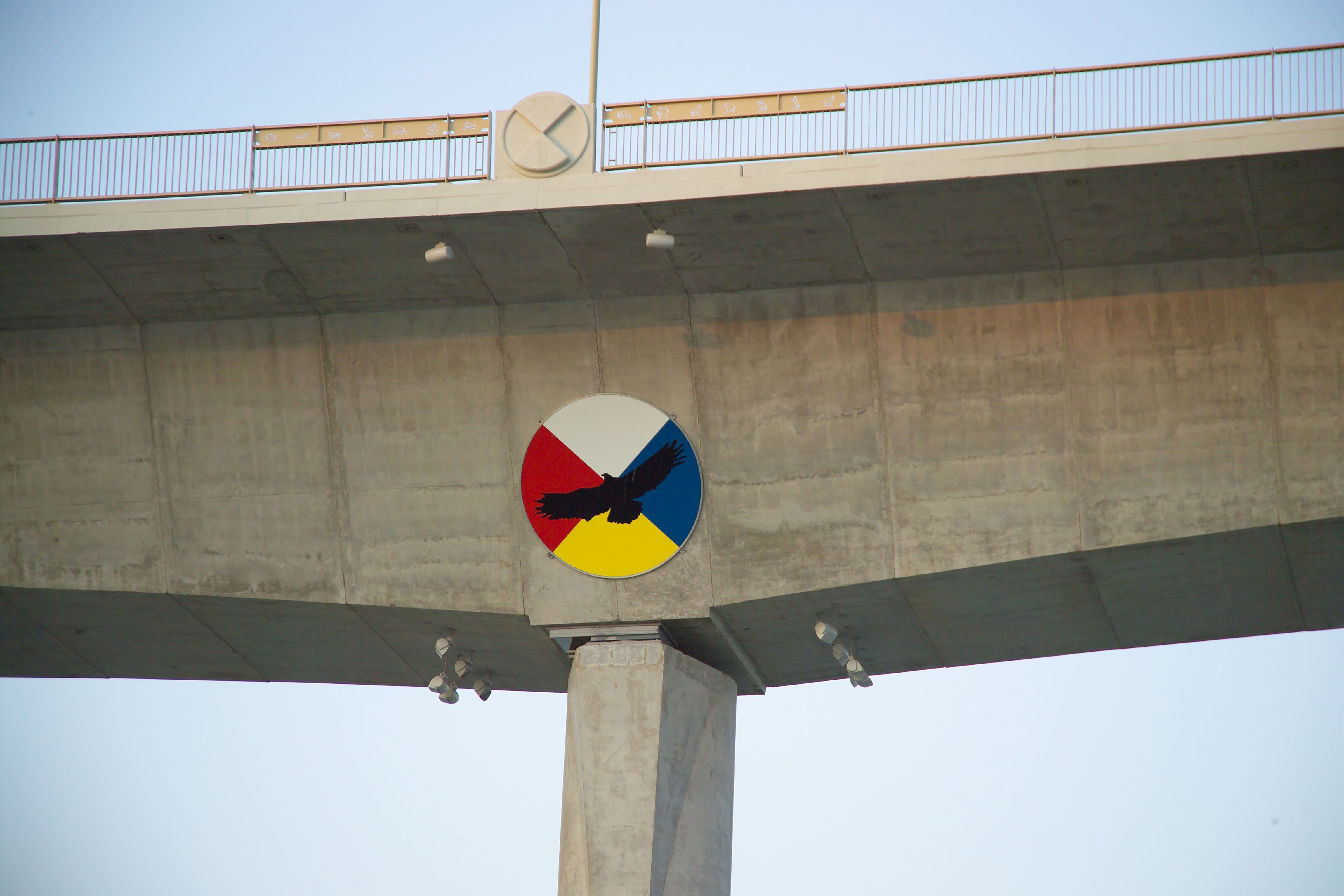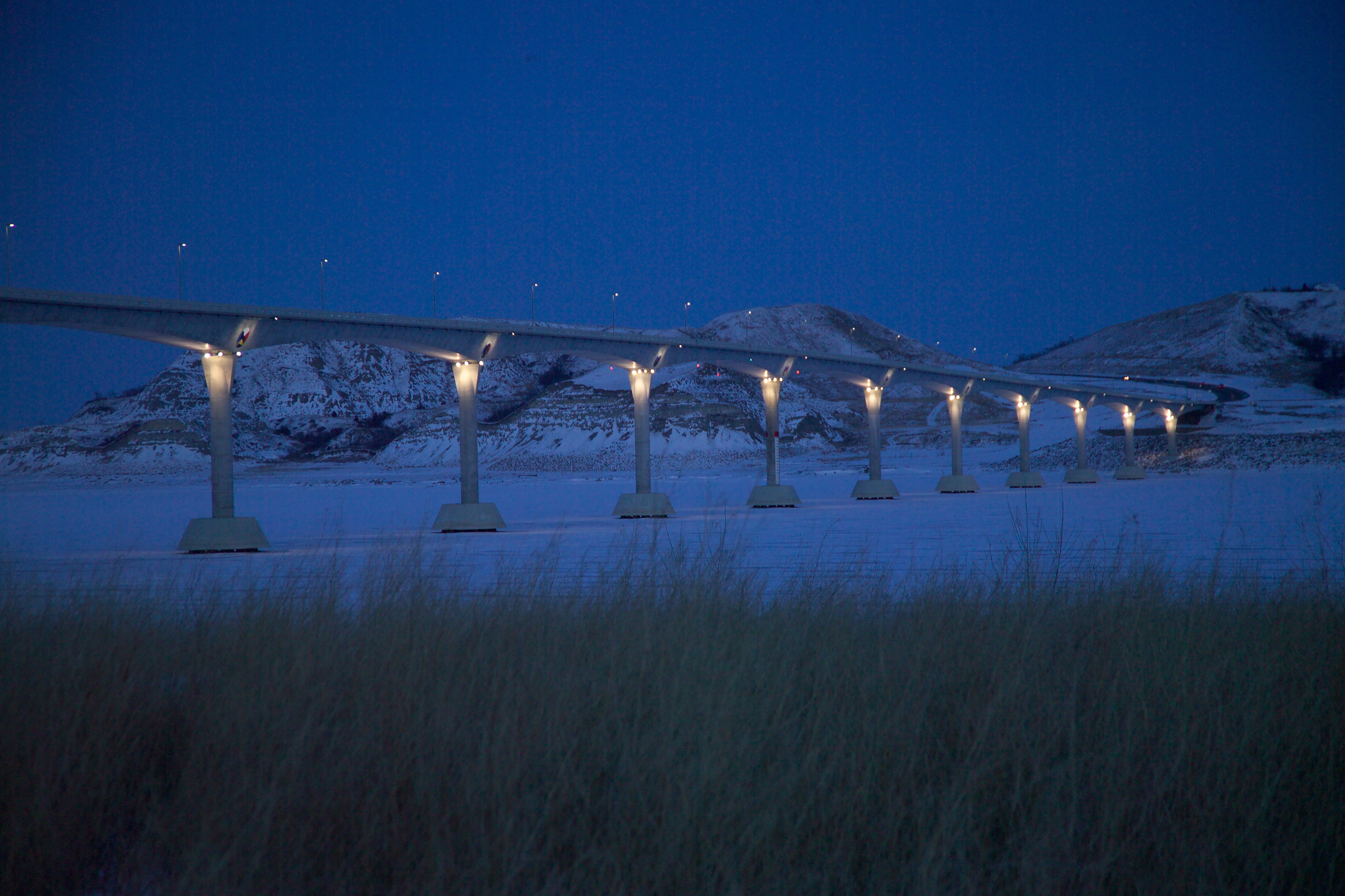 The Four Bears Bridge crosses the Missouri River near New Town, where the river is widened by the Garrison Dam, forming Lake Sakakawea. Shapes, colors, icons and images significant to the cultural history of the Three Affiliated Tribes come together to create a design that is contextually sensitive to the Native American environment. The design was developed through a design charette process to gain input from tribal representatives and local citizens. Severe winter icing of the deep lake resulted in the use of precast cofferdams that function as both a template for driving the steel piles and as a lost form for the footings, eliminating the expense of driving sheet piling during construction. The cofferdam shape is a 13’ tall conical frustum with a base diameter of 39’, chosen to deflect ice floes. The project included a design charette with the Three Affiliated Tribes, design of the precast concrete segmental bridge, design office support during construction and construction engineering inspection on site.