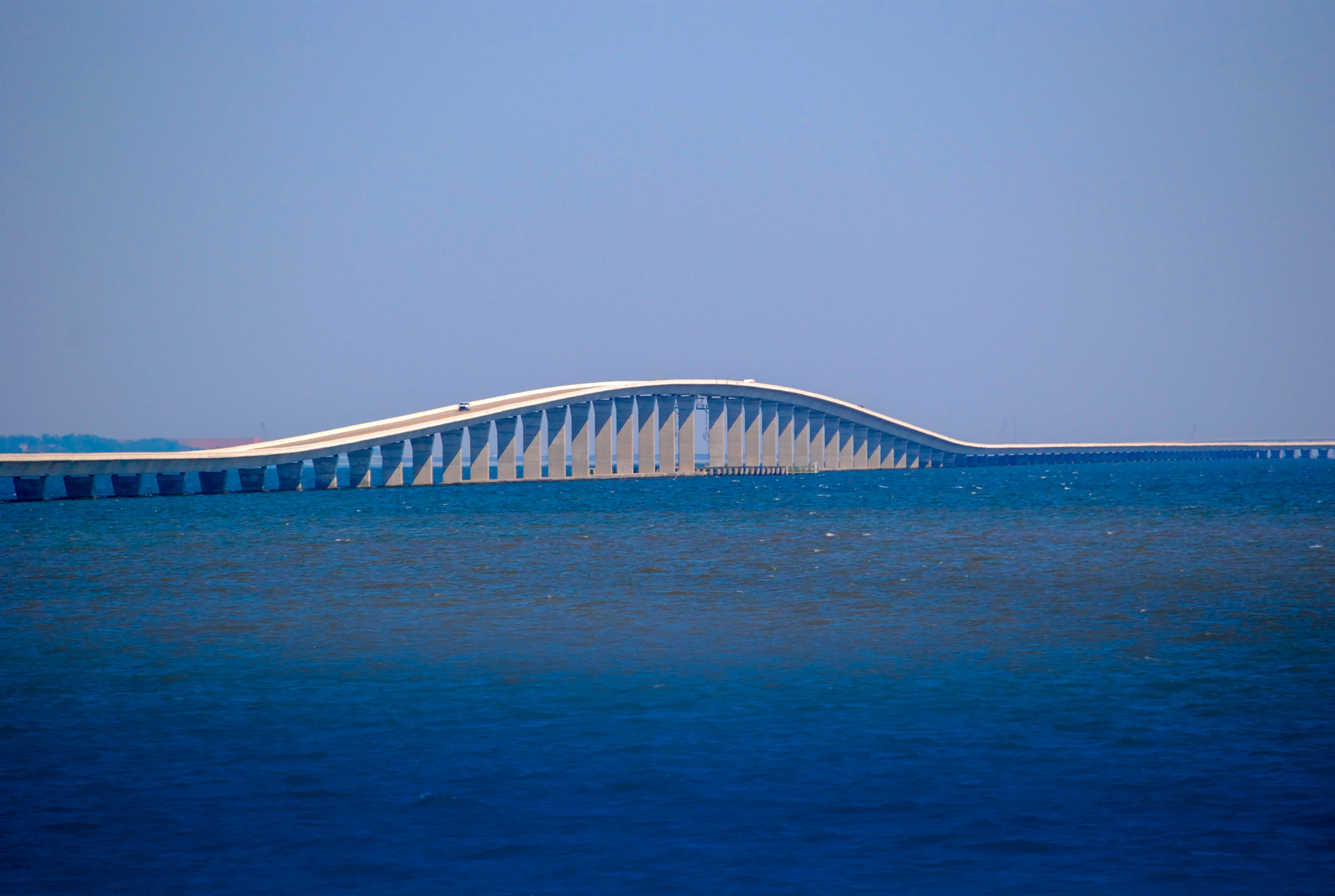 The 7.5 miles of roadway and 18,425’ long precast concrete segmental bridge were built in 29 months, one month ahead of schedule. Typical spans measure 140’ and were erected with the span-by-span construction method using a temporary erection truss that supported the segments from underneath the bottom soffit. The 225’ main span provides 65’ of vertical clearance over the navigable waterway and was erected using a modified balanced cantilever scheme with a temporary truss supporting the 140’ back span during construction.