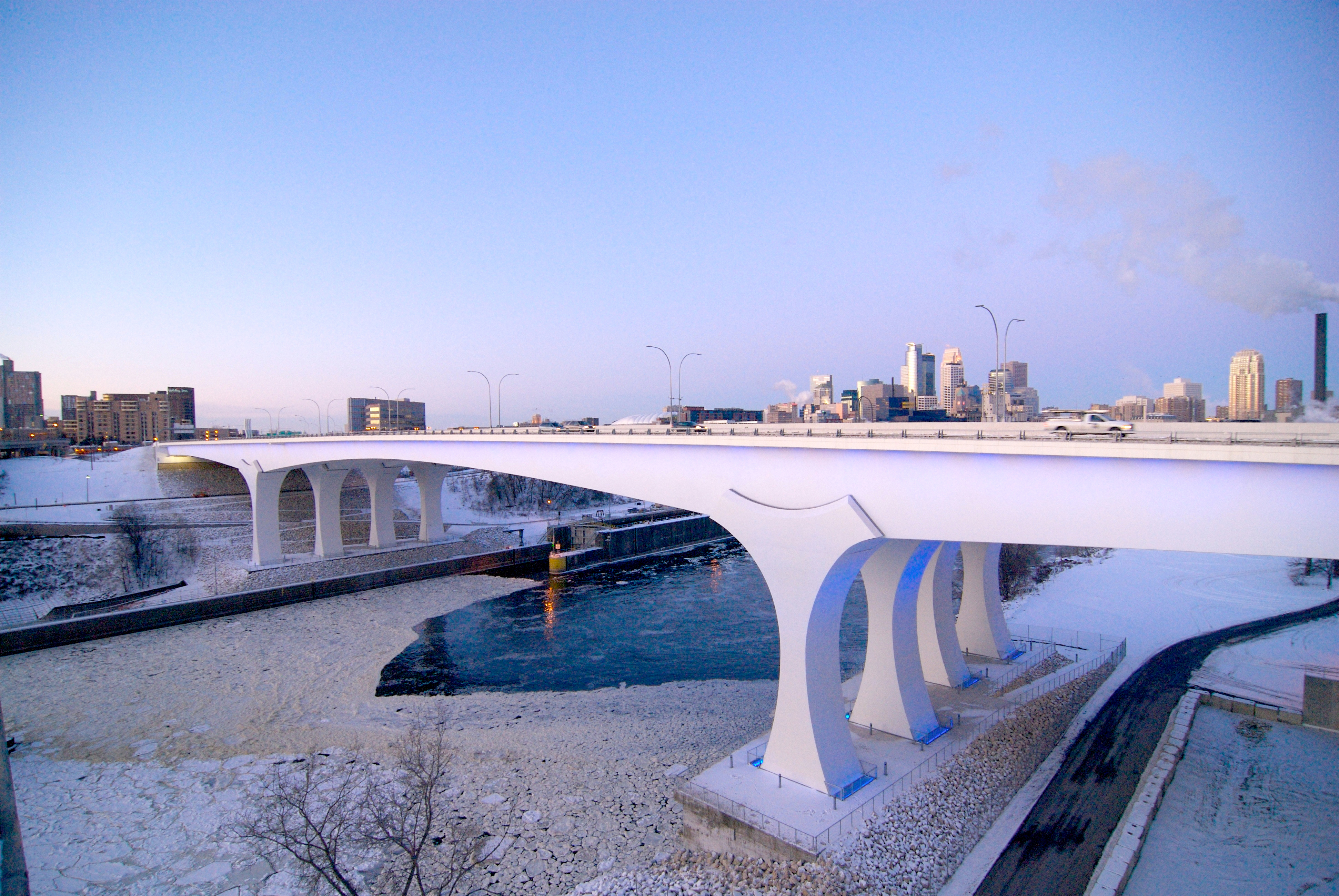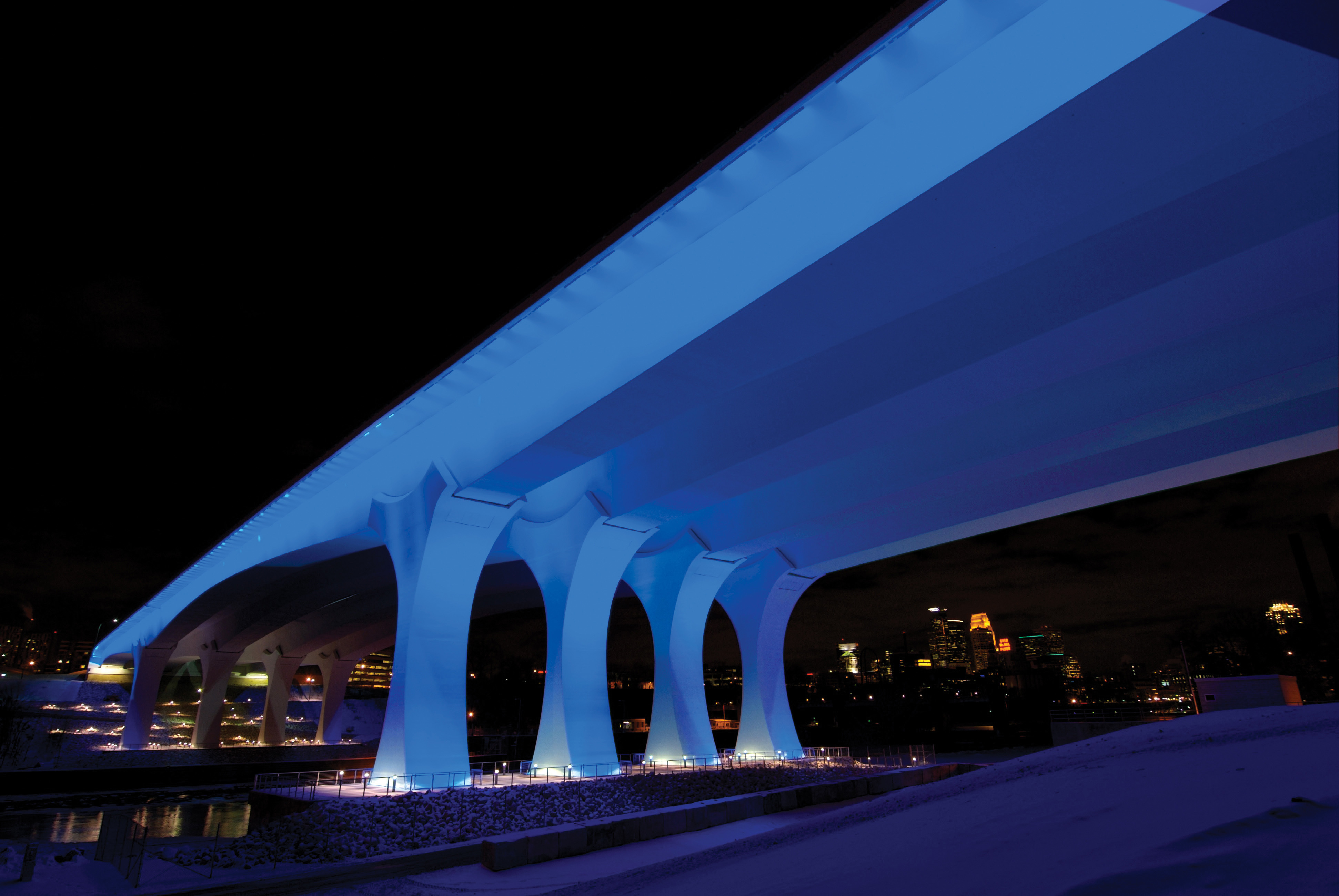 The bridge represents the first use in the United States of Light Emitting Diode (LED) highway lighting. Innovative self-cleaning concrete was used to create 30’ tall gateway sculptures, 3 rippling forms inspired by the universal symbol for water, that announce the river crossing. Close coordination of the design/build team led to successful completion of this project ahead of schedule and under budget, achieving Mn/DOT’s vision for quality, innovation, and safety. There were no lost time accidents on the project.