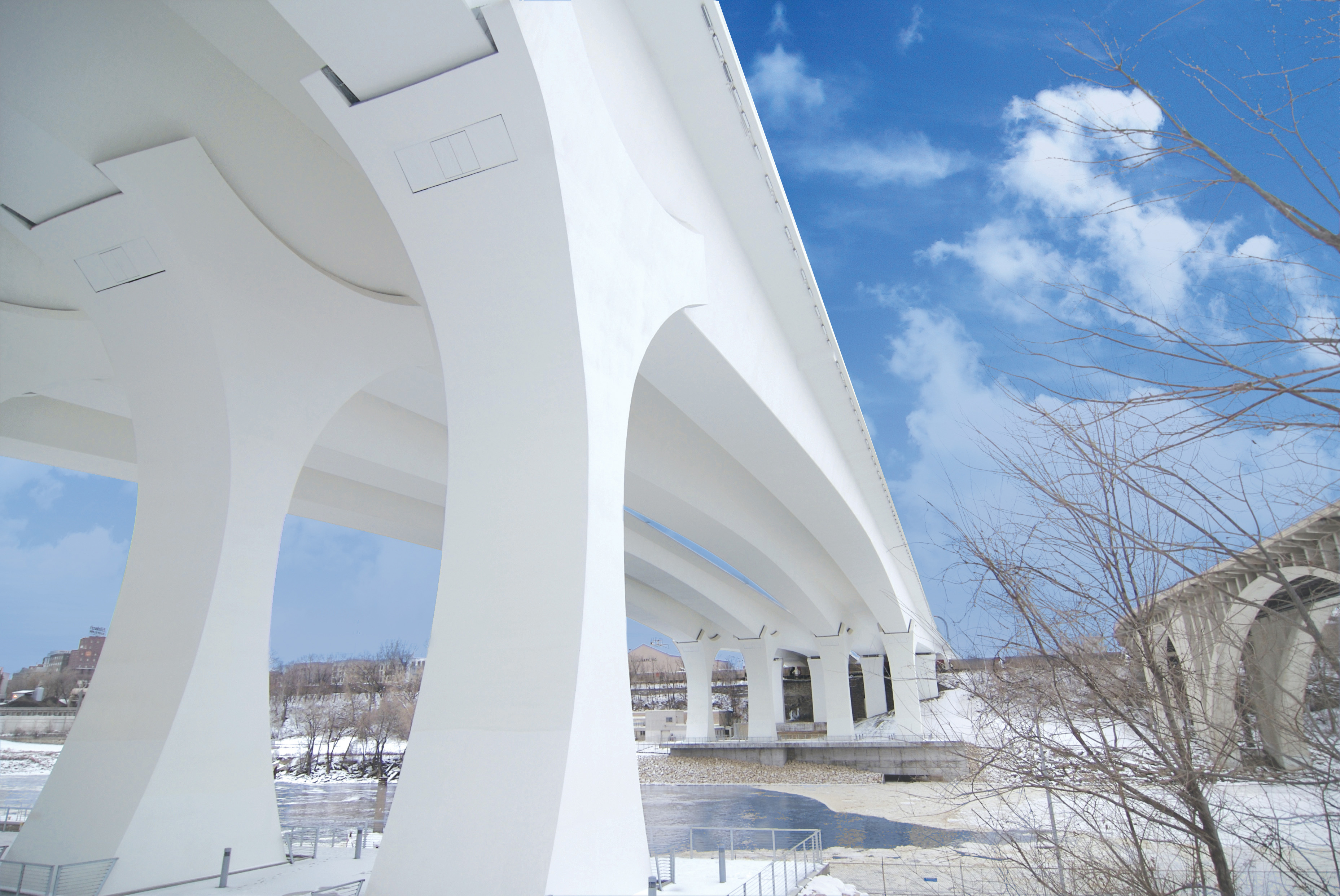 Emergency replacement of I-35W bridge over the Mississippi River on a fast-track design/build schedule. The new modern concrete bridge features spans of 330’-504’ (over the Mississippi River)-242’-147’. This bridge uses high strength concrete, multiple levels of redundancy and smart bridge technology. The elegant arching shapes, curved piers and white color create a bridge that fits in harmony with the surrounding site.