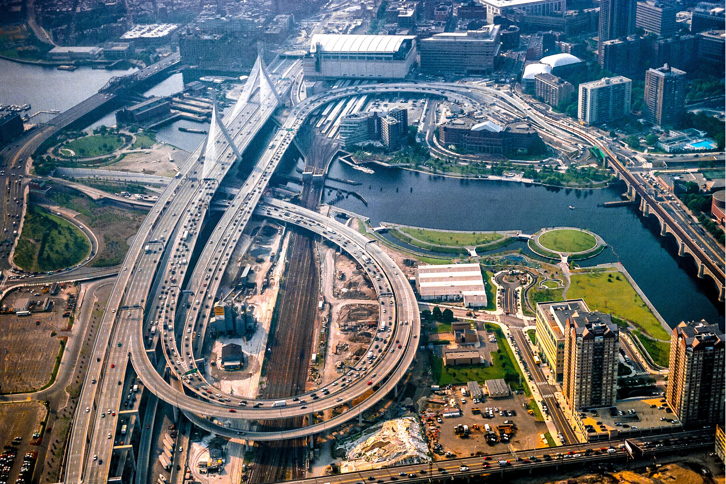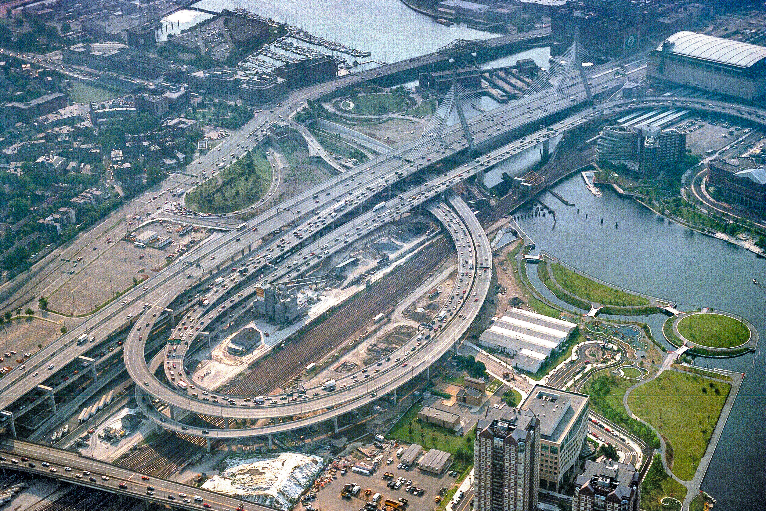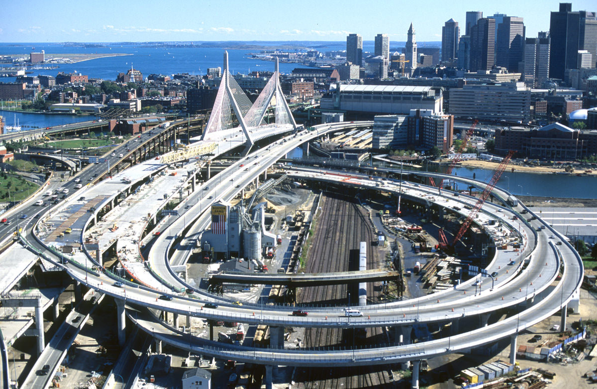 The concrete box shapes with uniformly sized circular pier elements create very clean lines that complement the adjoining Leonard P. Zakim Bunker Hill Bridge.