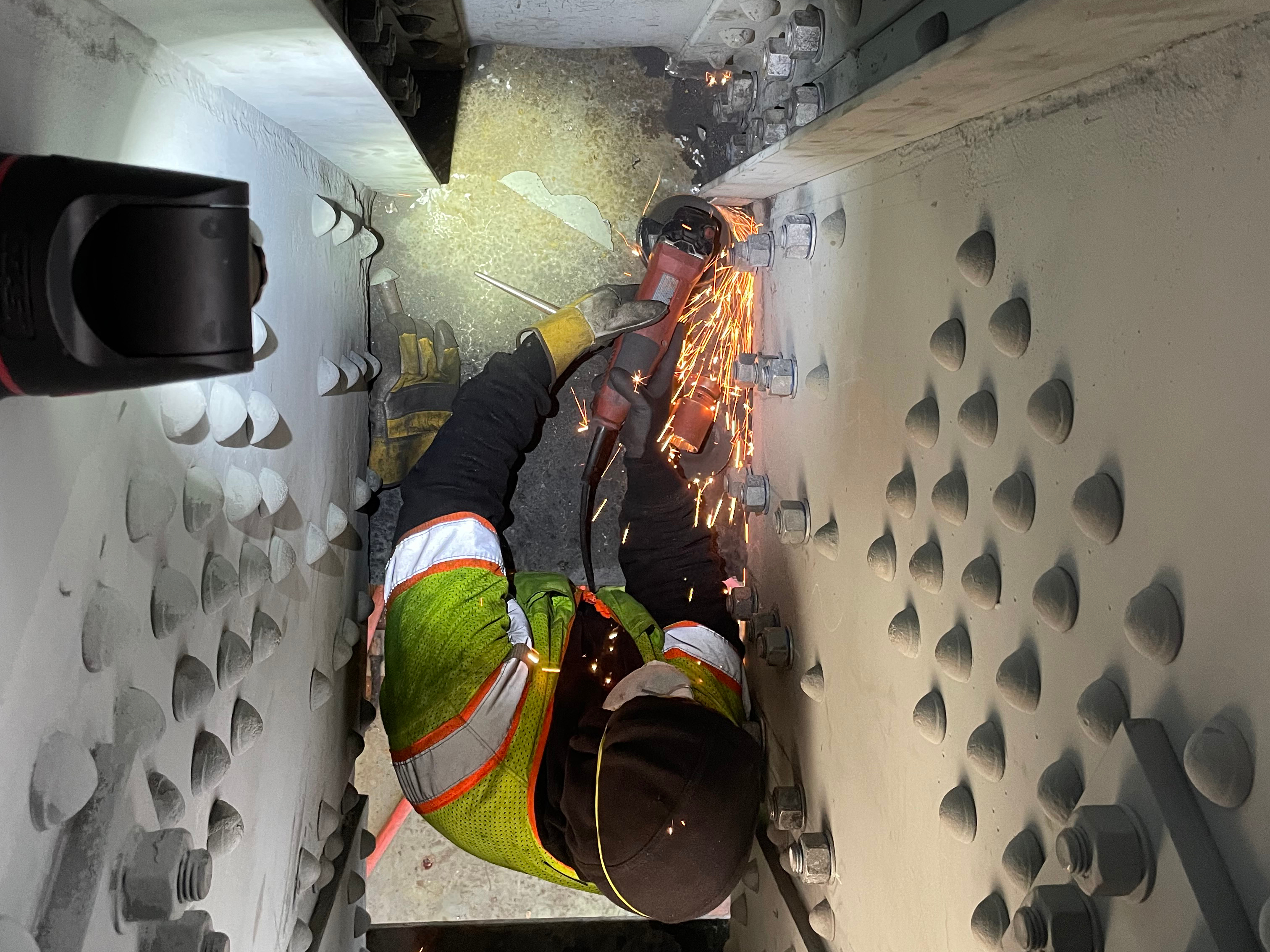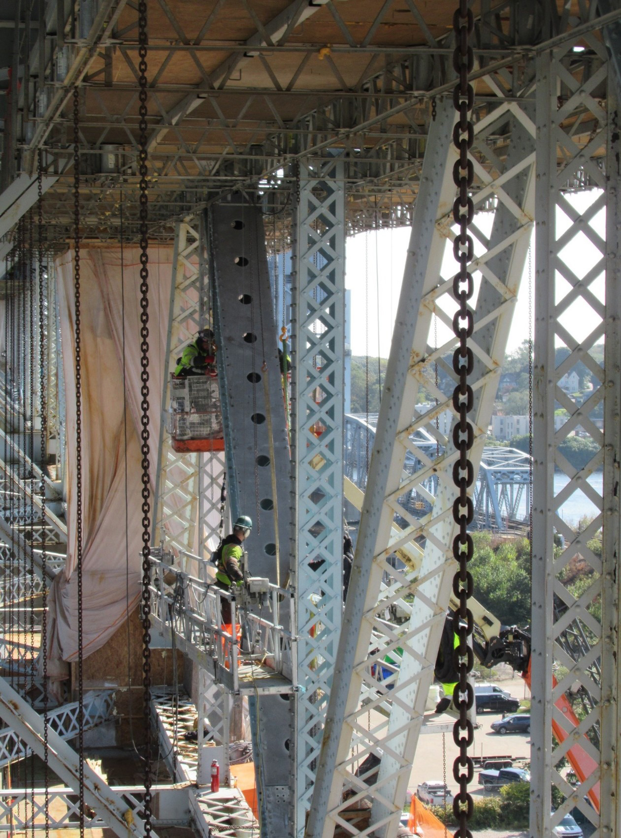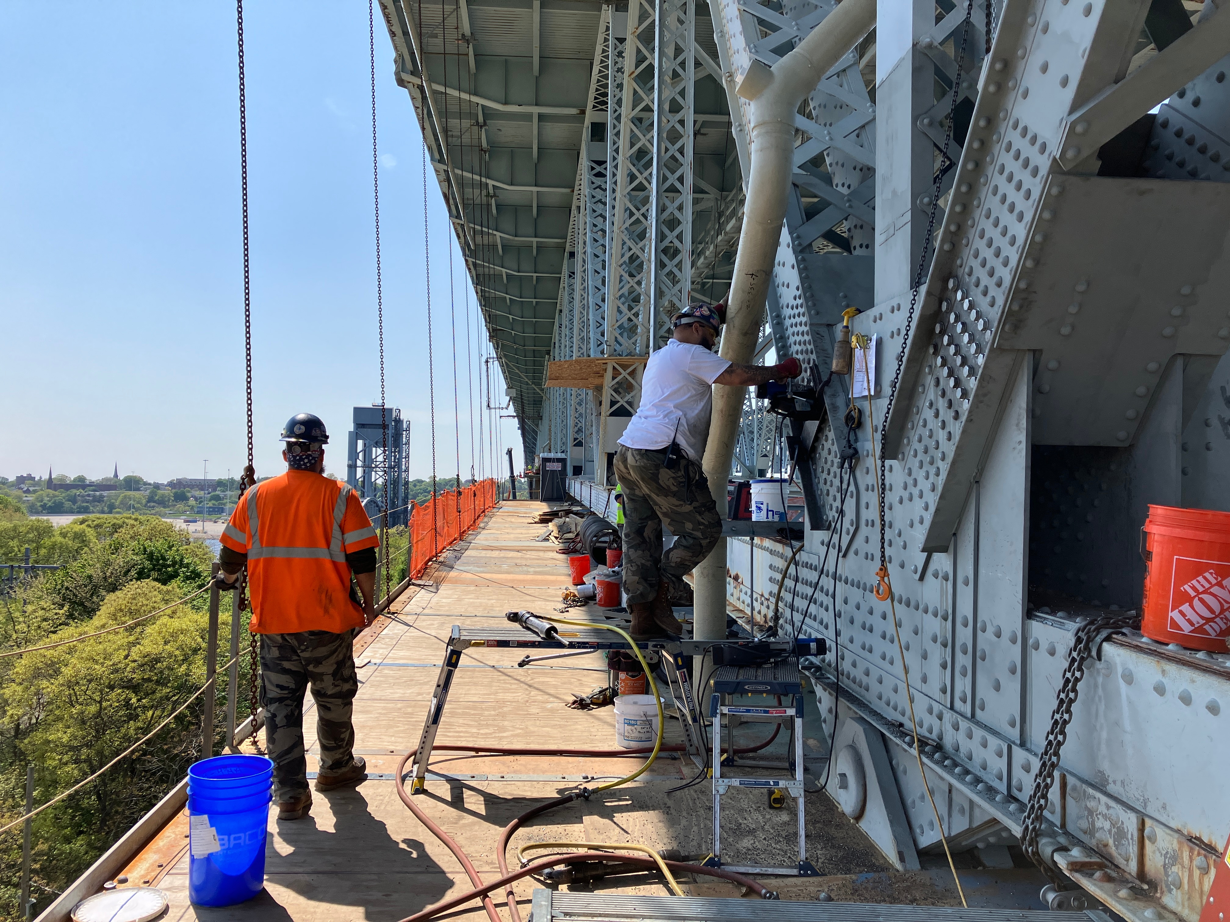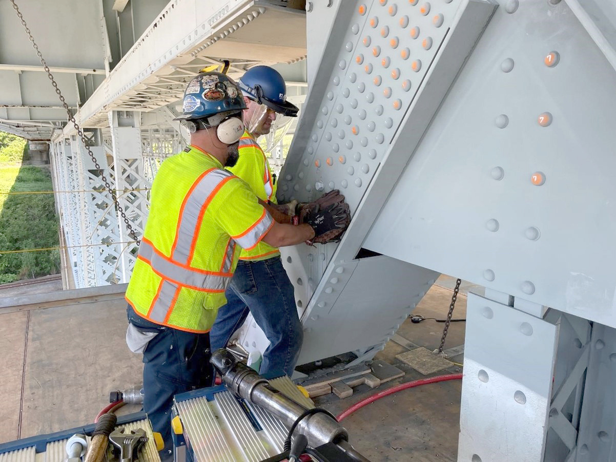 Activities occurring along with the strengthening operations include the removal and replacement of rivets with high strength bolts (Approximately 135,000 each) as well as abrasive blast cleaning and re-painting of the steel members adjacent to the strengthening locations.