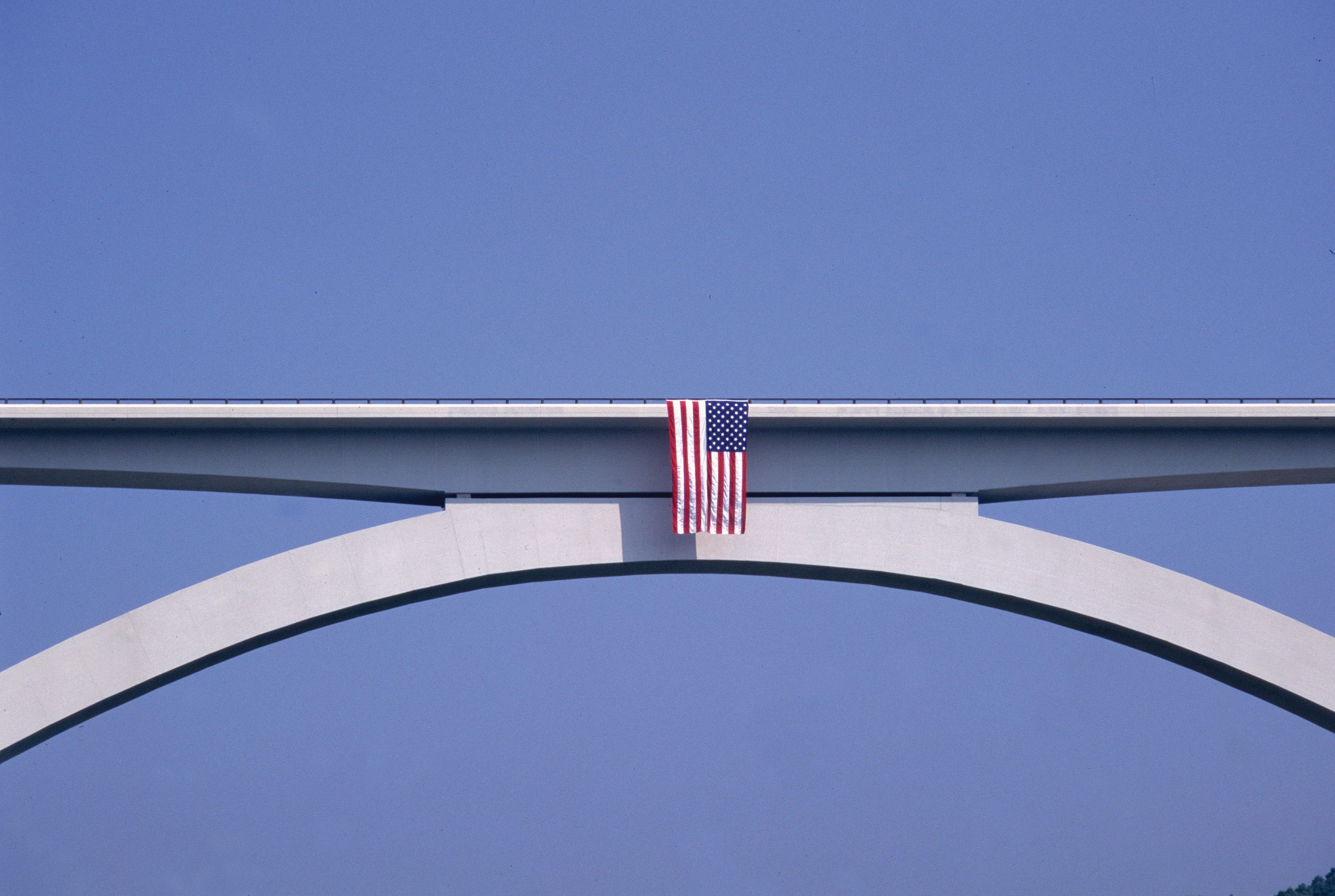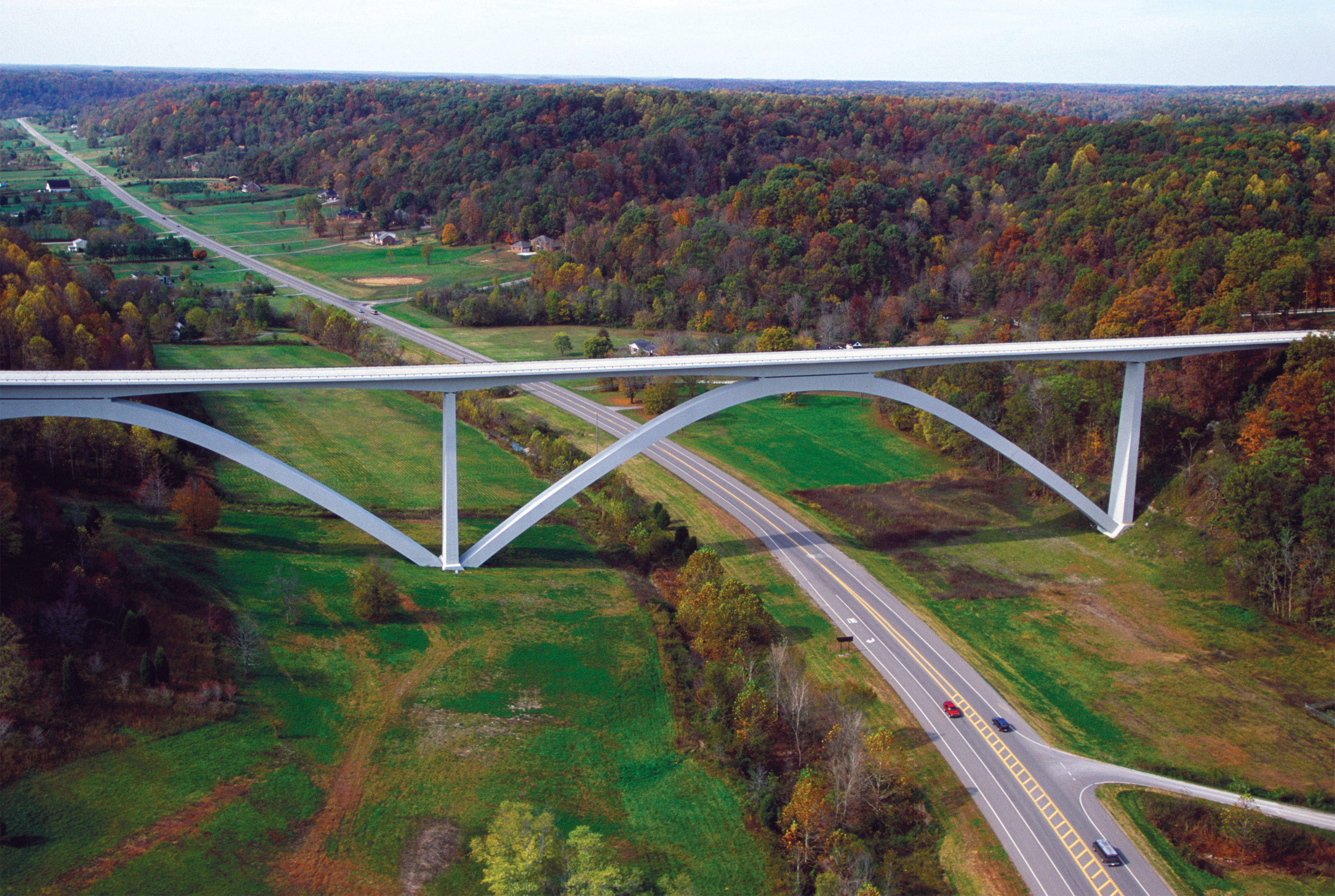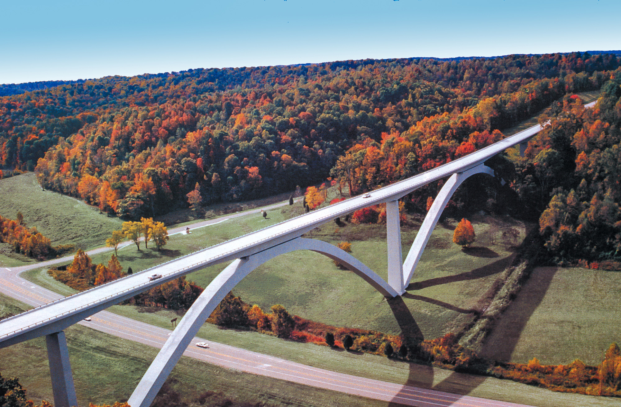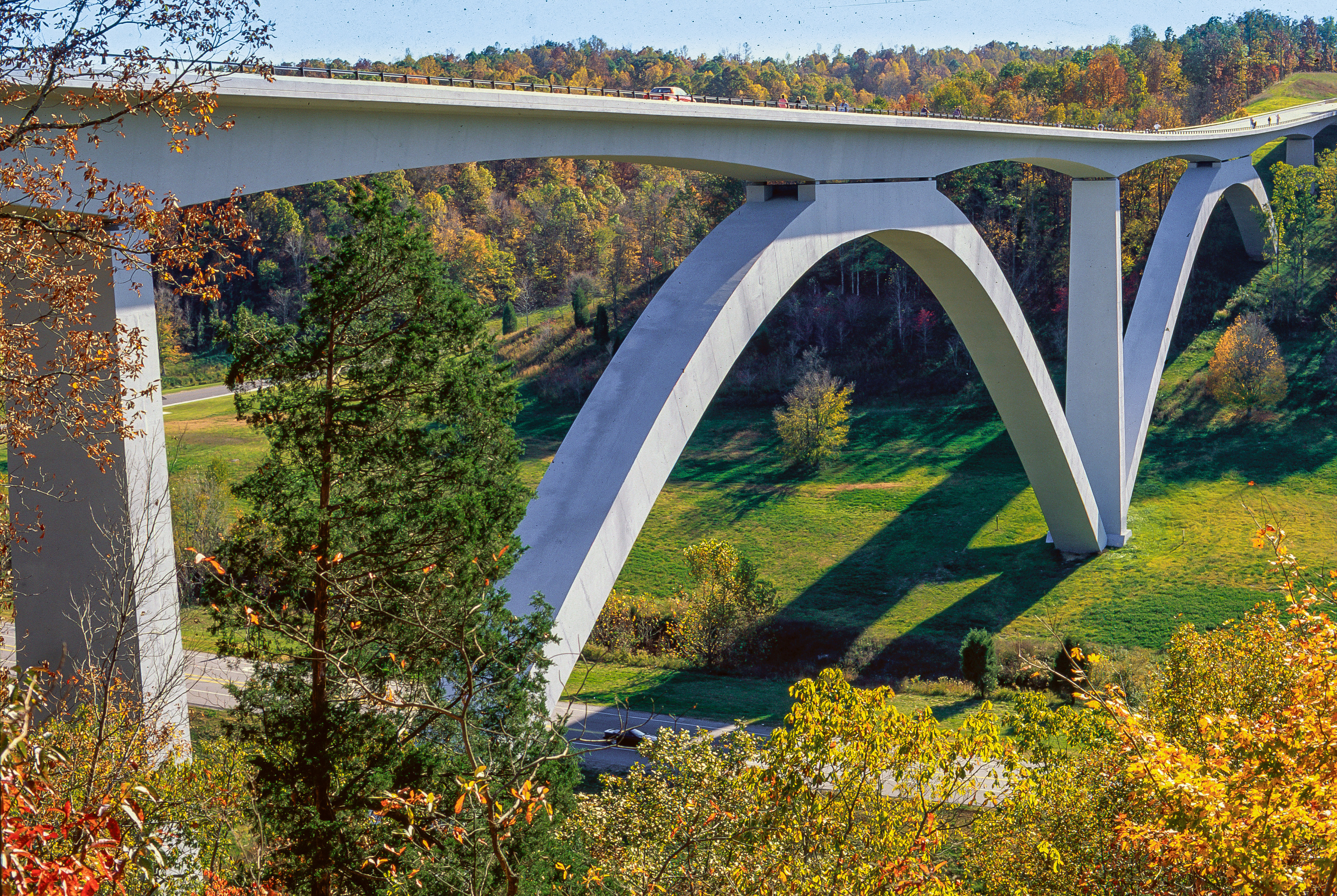 This artful Double Arch Bridge is 1,572’ long and carries the Natchez Trace Parkway over a scenic valley known as Birdsong Hollow and Tennessee Route 96, about 8 miles west of Franklin, Tennessee. The structure contains two arch supports which mimic the nearby hilly terrain. The 582’ long symmetrical main span arch and the 462’ long span of the second asymmetrical arch make this double arch bridge visually pleasing.