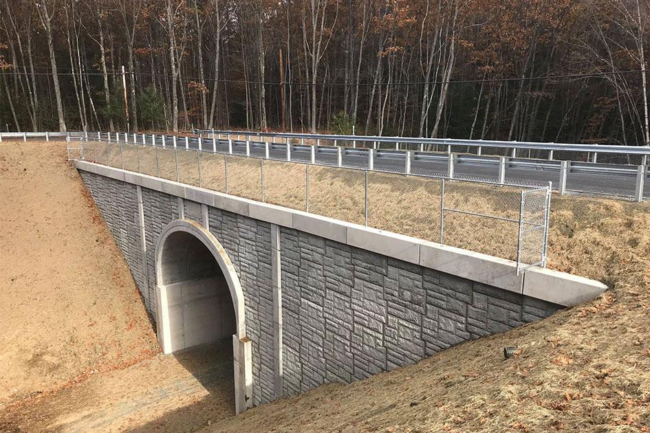 Under an On-call Bridge contract with NHDOT, GM2 was assigned Preliminary and Final Design services for this bridge replacement project. The previously existing timber bridge carried Mill Street traffic over the Ammonoosuc Rail Trail to Wilson Avenue in the Town of Haverhill. Constructed in 1940, the 147FT long bridge consisted of a timber deck, curbs, railings, beams, pier bents, and bracing. The bridge section provided a 16.6FT curb-to-curb width and an overall width of 18.8FT. The bridge was posted for a 6-ton weight limit. The new bridge is a fill over structure consisting of a precast concrete arch supported on cast-in-place abutment walls.