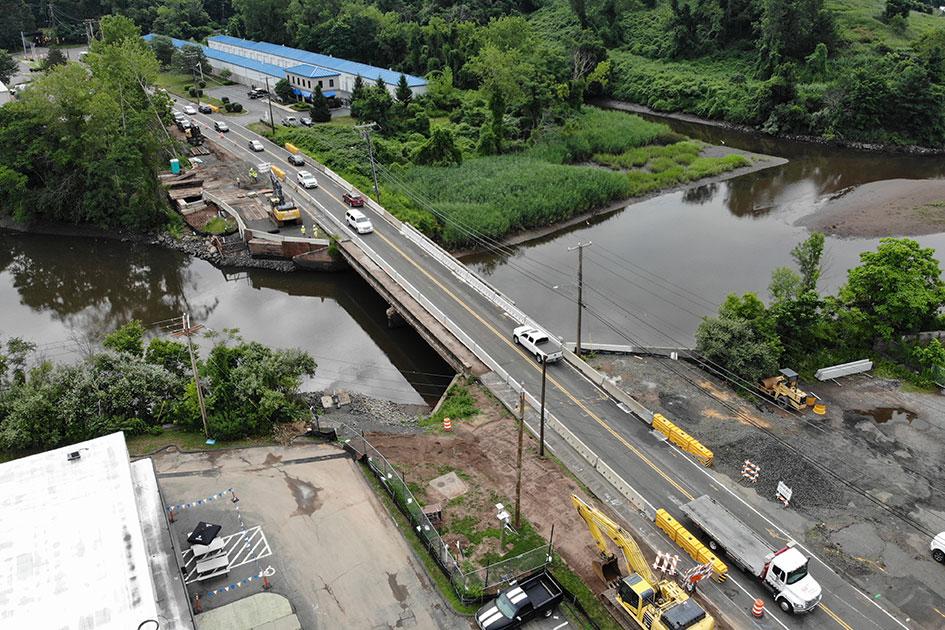 Project 100-175 involves reconstruction of Sackett Point Road and the replacement of State Bridge No. 03743 in North Haven, Connecticut. The roadway component of this work is approximately 1650 feet, east to west, and includes performing signal work at the intersection with Universal Drive, as well as adding roadway width and turning lanes. There are both overhead and buried utility relocations required, as well as new storm drainage being installed. The bridge replacement is in full, and is designed to occur in 3 phases over the course of 3 construction seasons. The existing two-span bridge is severely corroded and has reached the end of its service life, and will be replaced by a two-span integral abutment bridge founded on piles that is approximately 164’ long and that meets current geometric, load and service standards. There are a series of complexities to this project. The river, on average, has a 6-foot tidal swing and both ebb and floods with the tides each day, providing for very difficult construction and challenging environmental conditions. The site has abutters on each corner of the project, leading to more public information and public relations outreach, as well as staging of construction activities, materials and equipment. The road itself has a relatively high traffic volume (ADT) which resulted in the Town and State determining that closing the road to expedite construction was not feasible, nor was alternating traffic allowed, due to the volume of cars and backups that would result. This constraint led to the bridge being designed to be built in thirds, in 3 stages, resulting in a wider new bridge, while allowing for sidewalks and shoulders. Essentially, a new lane of bridge is built each construction year, working from north to south while replacing the in-service bridge as it progresses. There are buried utilities that are vital to the Town of North Haven under the river, immediately next to the bridge. These include a 20-inch water main and a 30-inch sewer main that flow in a "siphon" under the river. The construction of the new bridge is very close to these facilities, and they are to be closely inspected, monitored and protected throughout construction. The Contractor installed a series of survey prisms attached to sleeve rods that sit on top of the water main, as well as in the soil next to it, to hourly monitor if there are any shifts or settlement. The sewer main was stopped for a period pre-construction and a robot with a high-definition camera run through it, to check for any problems ahead of construction, as well as to record its condition before major activities. Finally, there are seismographs and sub-surface microphones installed in the soil around the bridge to monitor the pile and cofferdam driving activities and to ensure nearby structures are not compromised by this work. The tidal swing, the level of monitoring, and the barge-mounted work on the inner island during Stage 2 of construction are unique. This is also a newer bridge design philosophy, with integral abutments and wingwalls, and encased beam ends. There is also a complicated sequence of cofferdam installation in the river, working around the existing pier, as well as a tremie seal necessary to construction the pier footing, below the water level, in the dry.