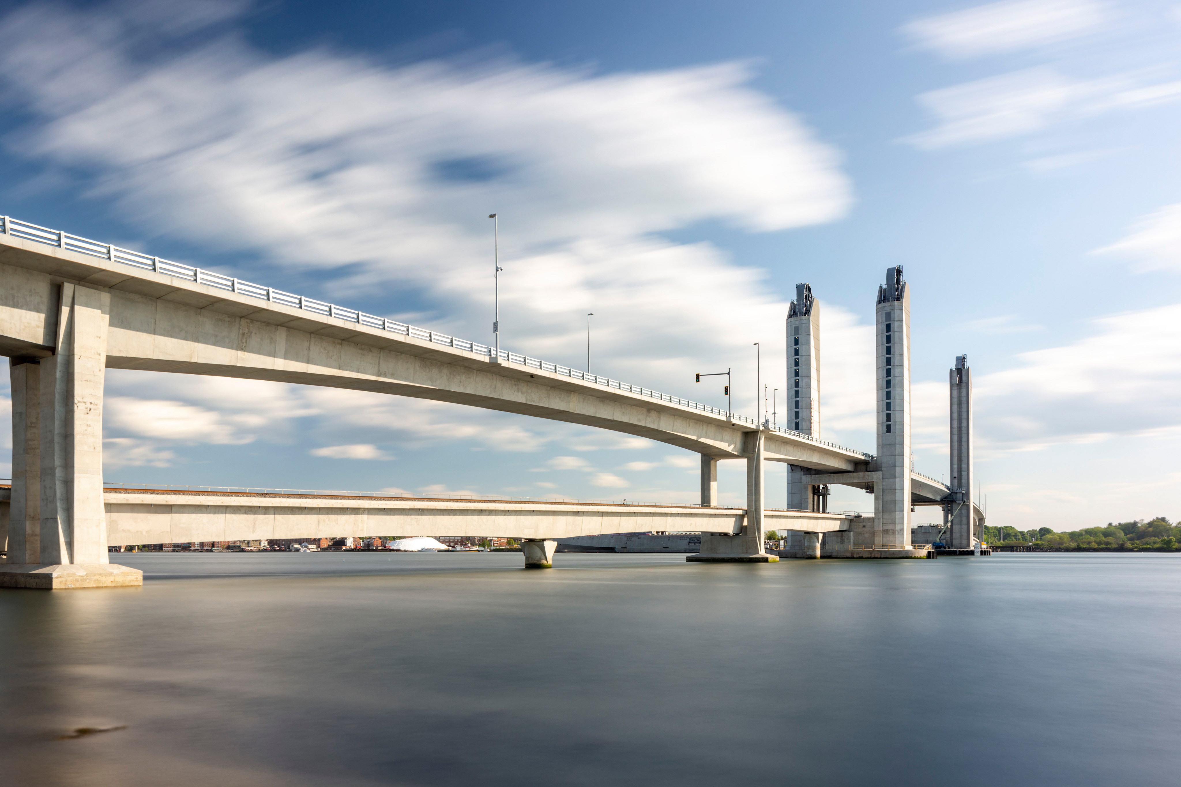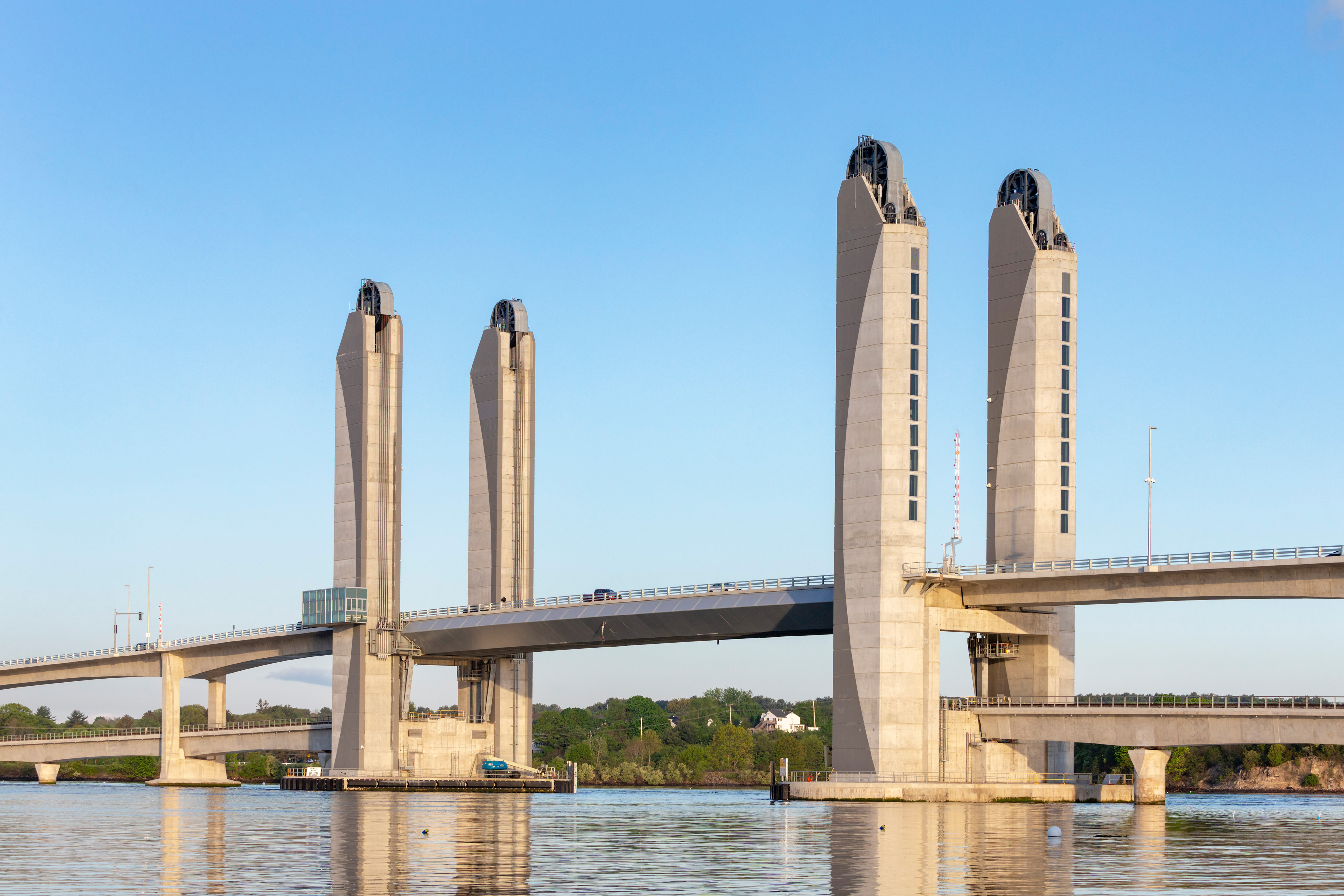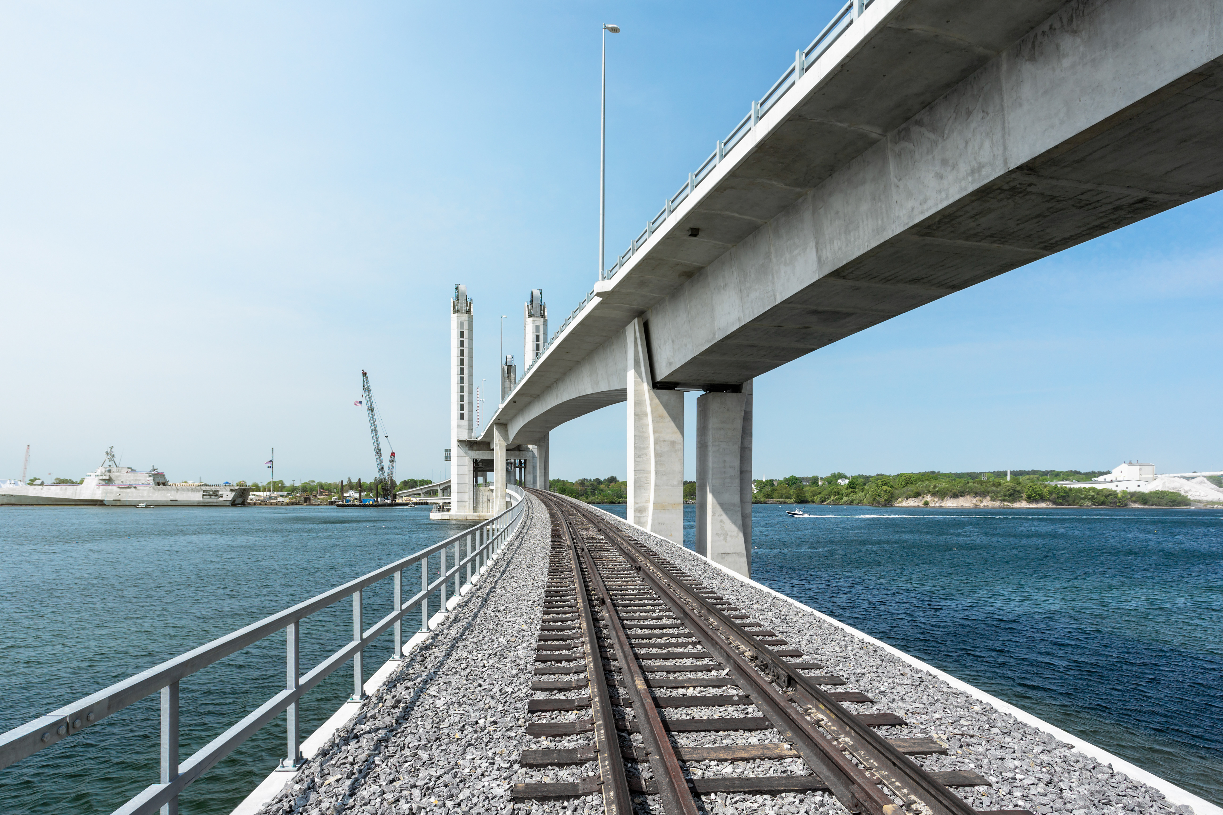 The innovative Sarah Mildred Long Bridge is a vertical lift bridge that serves two modes of transport (rail and roadway) which reach it from double-decker approach spans. The bridge connects Kittery, ME and Portsmouth, NH, carrying US Route 1 Bypass and heavy rail. Its vertical lift span is 300’ long and 50’ wide with railroad track running down its center and roadways on both sides. The span “rests” in the roadway position, lowers 50’ to carry rail, and raises 135’ for tall maritime vessels.