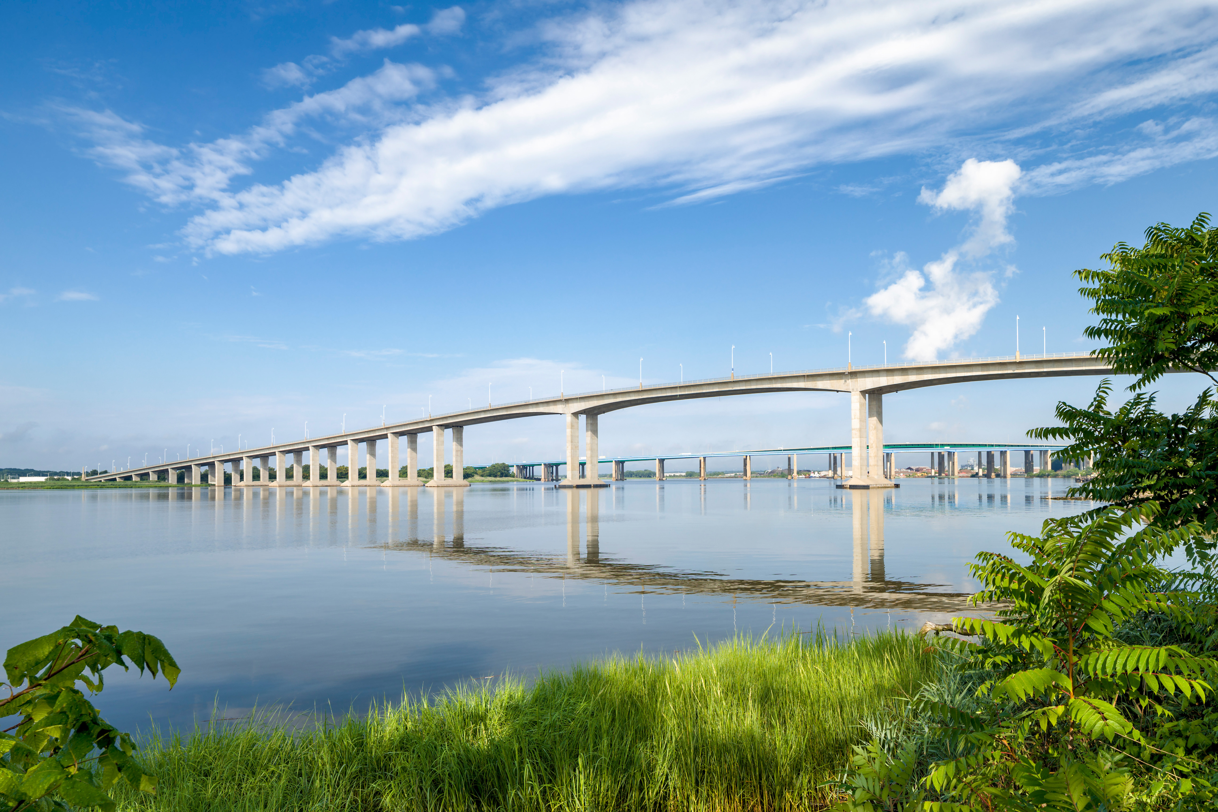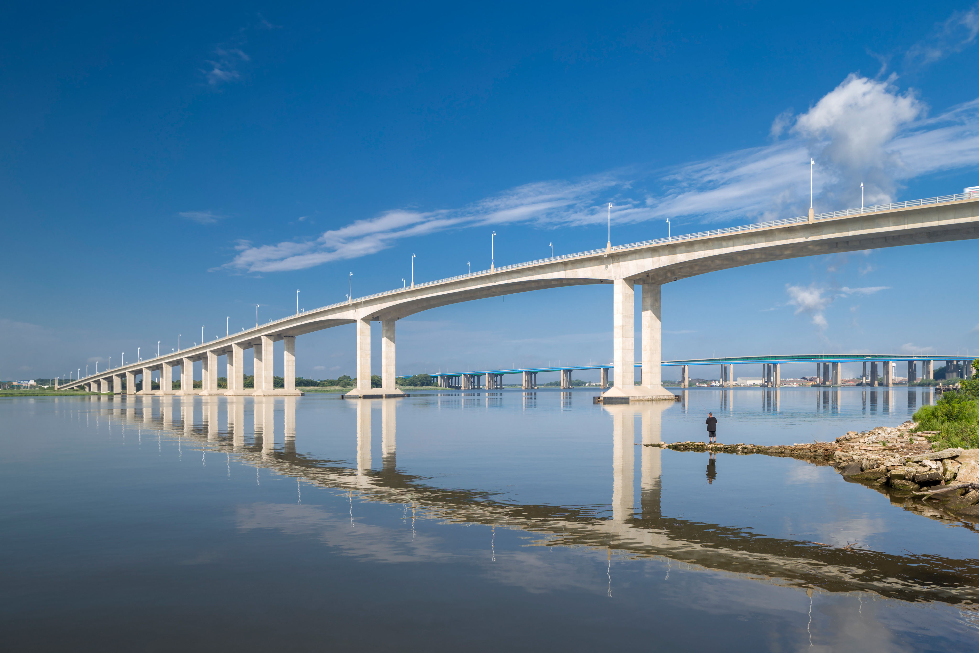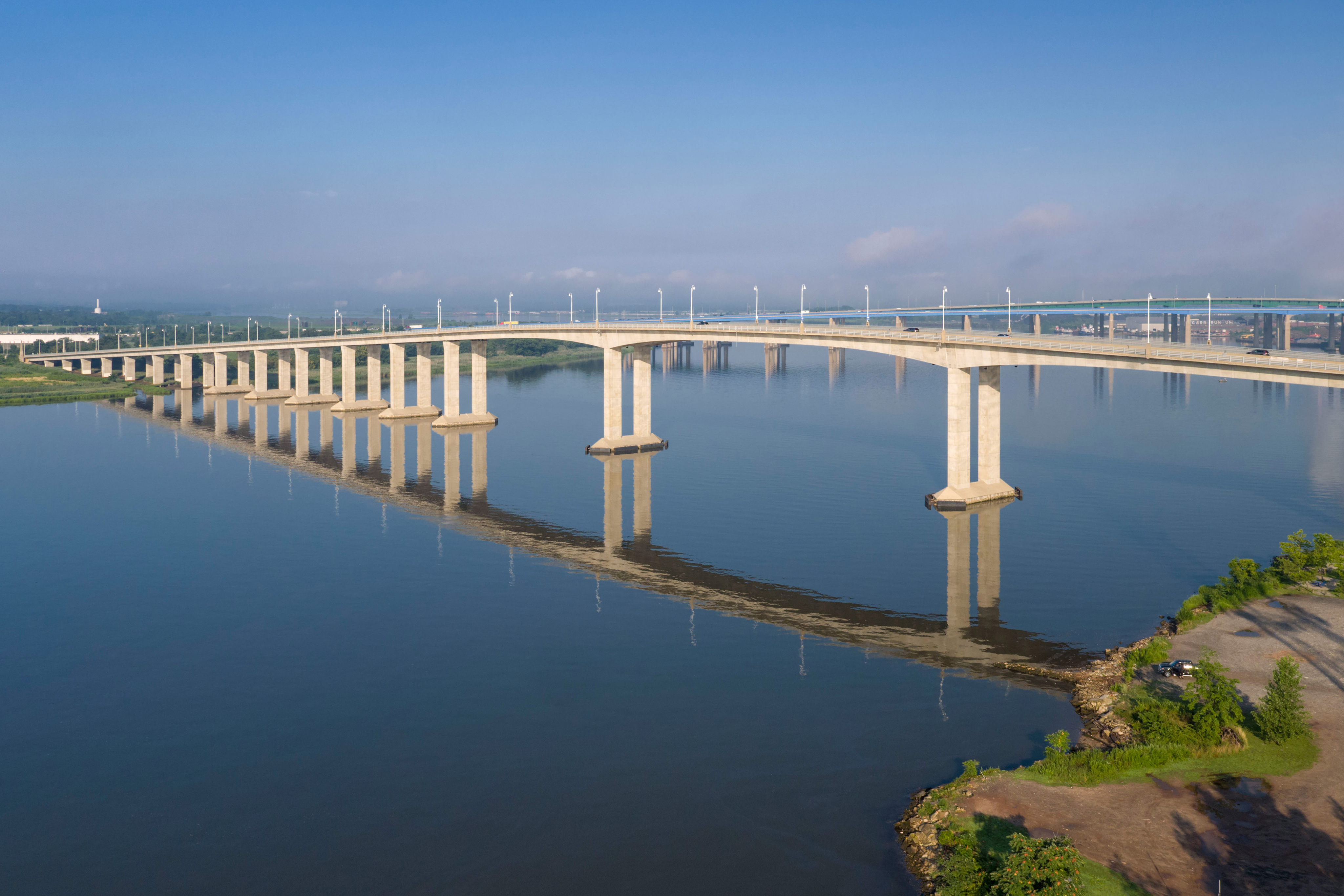 The Victory Bridge consists of twin 3,971' long structures and features a 440’ long precast concrete segmental main span built in balanced cantilever. This span length was chosen to accommodate significant shipping traffic on the river, providing a 355’ navigational channel. The southbound span was opened to traffic 15 months after construction began, and the northbound span was erected in just nine months. The bridge was built sequentially alongside the original structure. Two-way traffic was shifted to the new southbound span, while the northbound structure was constructed in the original bridge's footprint. Approaches were constructed using precast segmental span-by-span methods. The bridge is founded on 55 drilled shafts that vary in diameter from 6’ to 8’.