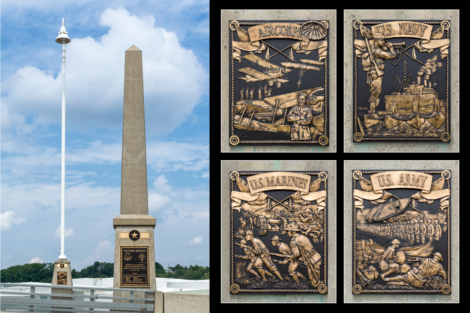 The original 75-year-old swing span bridge was dedicated to honor World War I veterans. The new bridge continues this tradition with memorial obelisks at the abutments, incorporating bronze plaques from the existing bridge and two new plaques. At 150’ intervals along the bridge, light poles and pilasters display commemorative bronze plaques, creating a visual tribute to the victory of World War I.