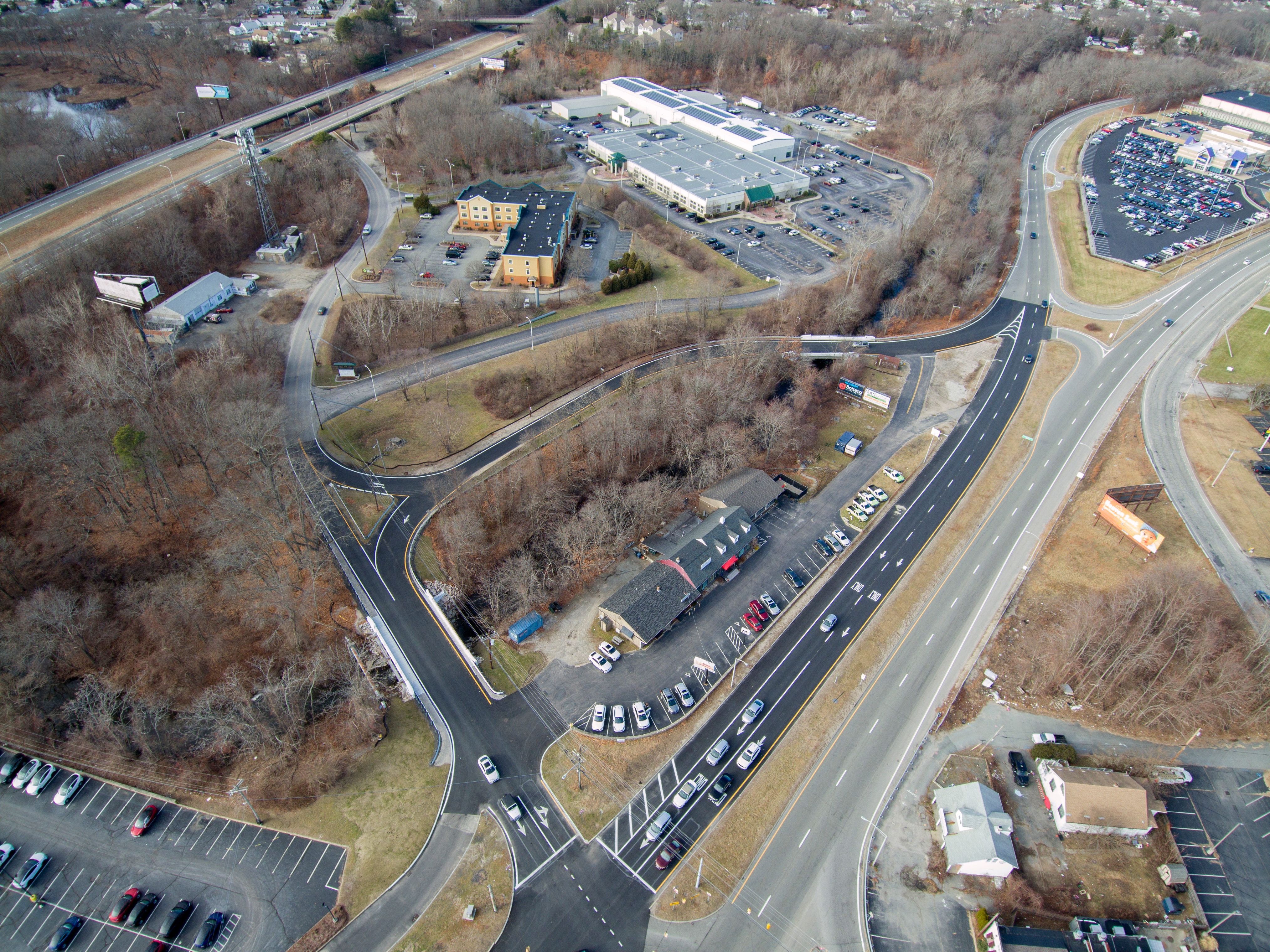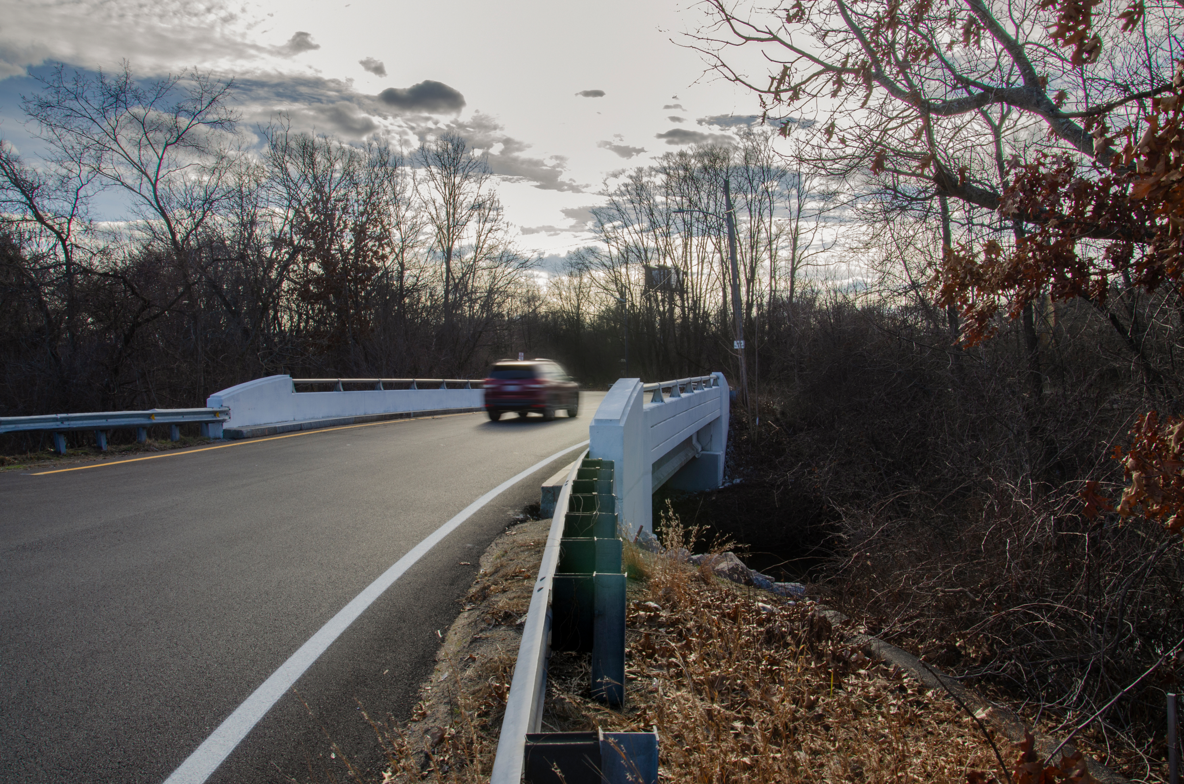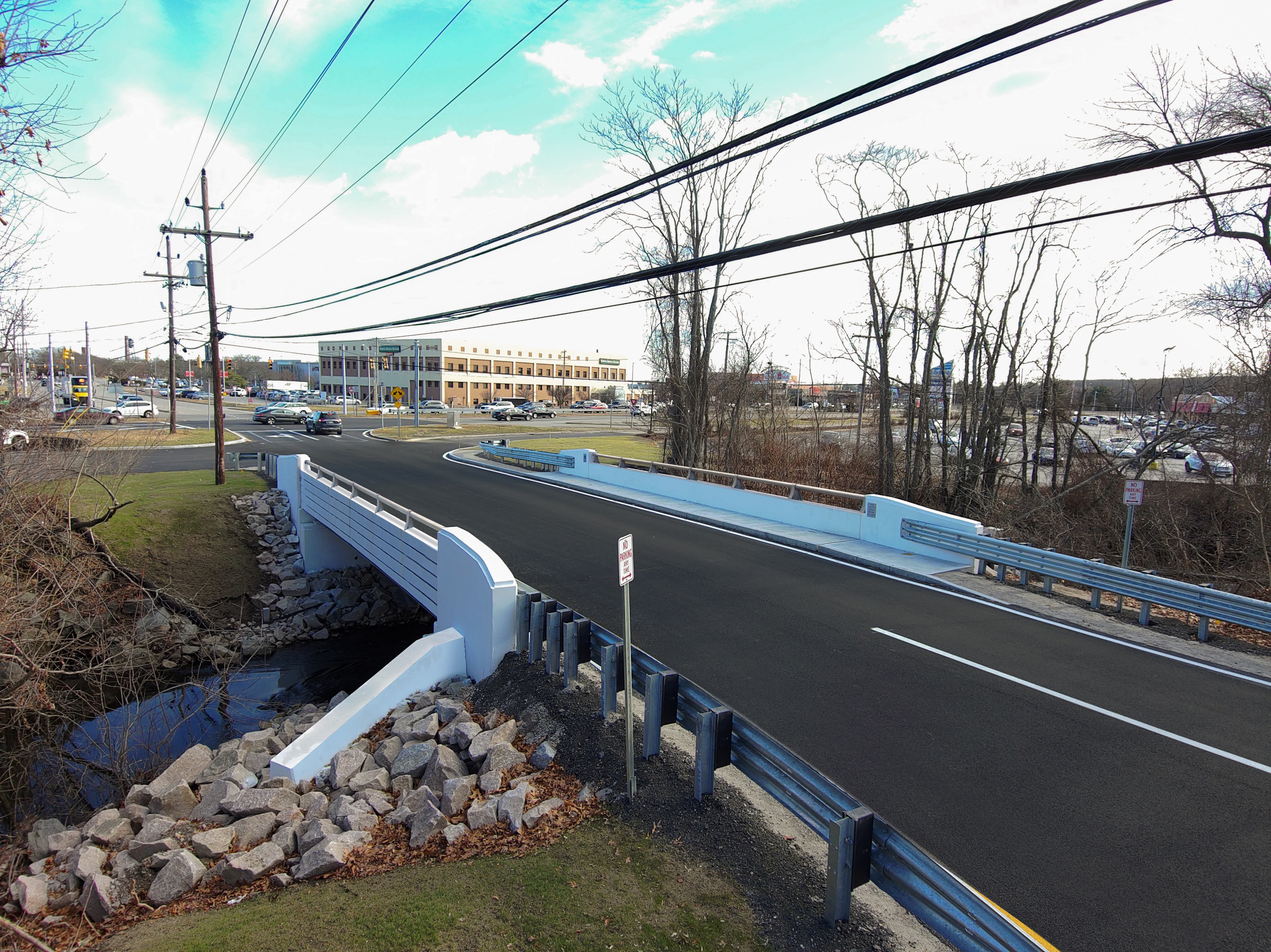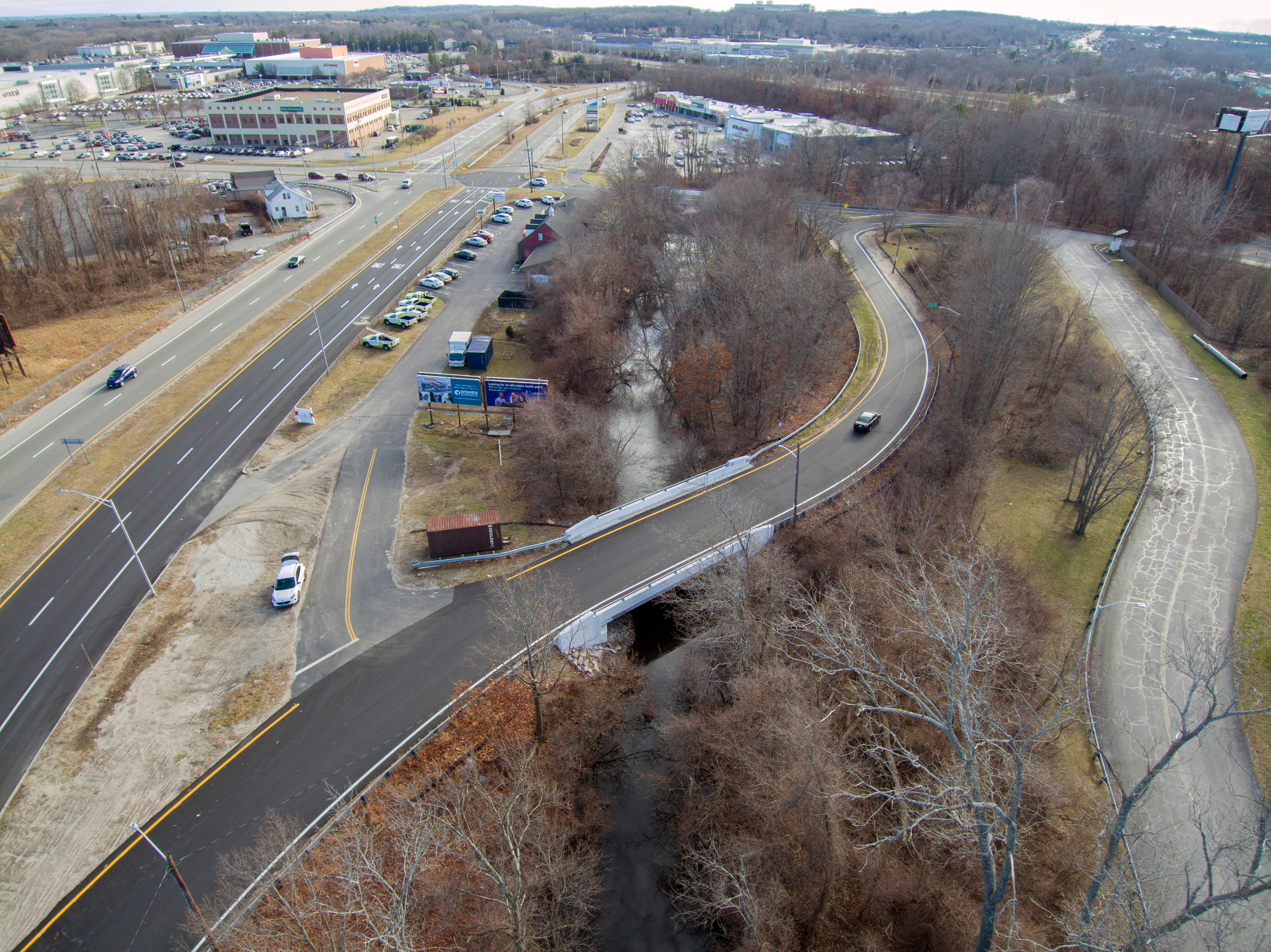 Replacement of West Natick Road Bridge No. 820. This bridge replacement project involved the complete replacement of the entire bridge superstructure and substructure, while re-using the existing h-piles. Work included installing a temporary utility bridge for a temporary gas line, complete demolition of the original bridge, completely new concrete abutments and end posts, new steel beams with precast modular concrete deck sections, cast-in-place deck closure pours, new sidewalk, safety walk, parapets, and aluminum bar rail. In addition to all of the bridge work, GM2 also designed the new repaved approaches with bituminous pavement and new guardrail at all four corners of the gas line. The design of the new bridge is similar to the original bridge with some changes to the pavement support.