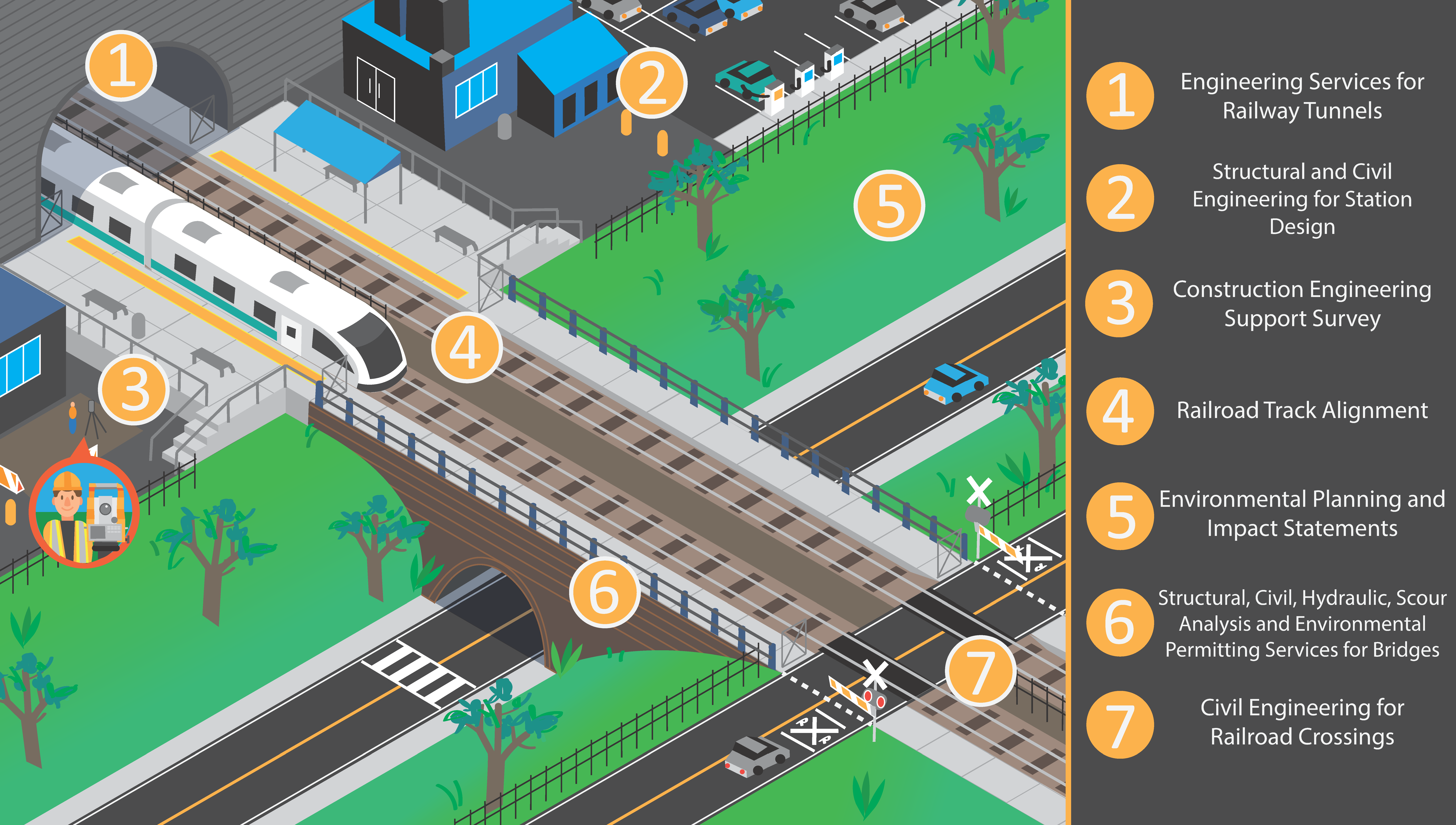 GM2 collaborates with rail and transit clients to develop solutions that enhance the user experience and client needs. From the development of track alignments for mainline track, shops and yards to special track work and the rehabilitation of railroad facilities such as MOE buildings, shops and yards as well as bridges, stations and platforms to site infrastructure improvements, GM2 has the resources and expertise. Our staff has performed track alignments and rail transit engineering services for projects throughout the United States, as well as internationally, for clients that include Amtrak, Metro-North, NJ Transit, PANYNJ, LIRR, Honolulu Rail Transit, BNSF, CP, Norfolk Southern, CSX, FRA and FTA.